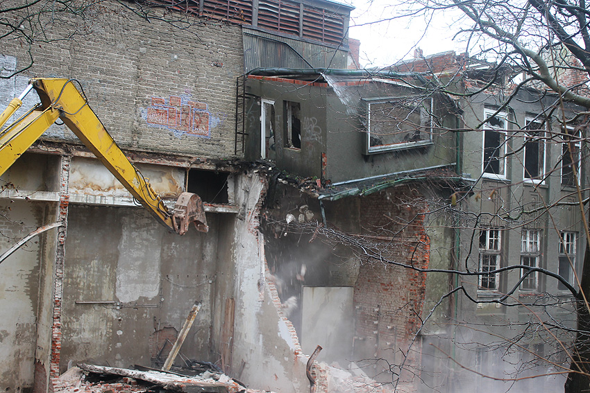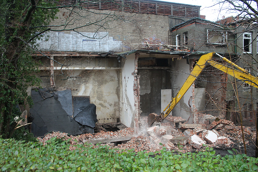 11.12.14: Nun wird im Südbereich direkt neben dem Verwaltungstrakt entkernt und scheinbar auch hier ein Abbruch vorbereitet.