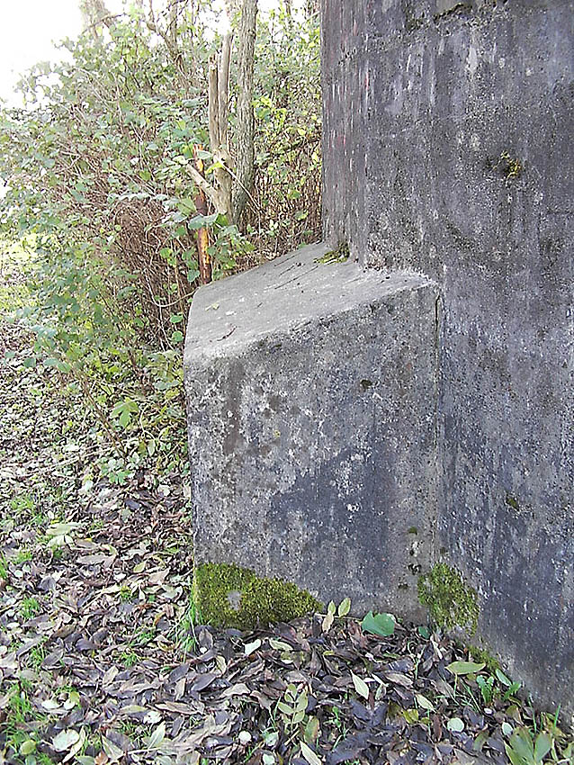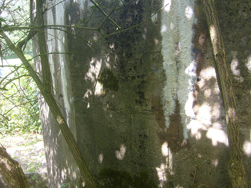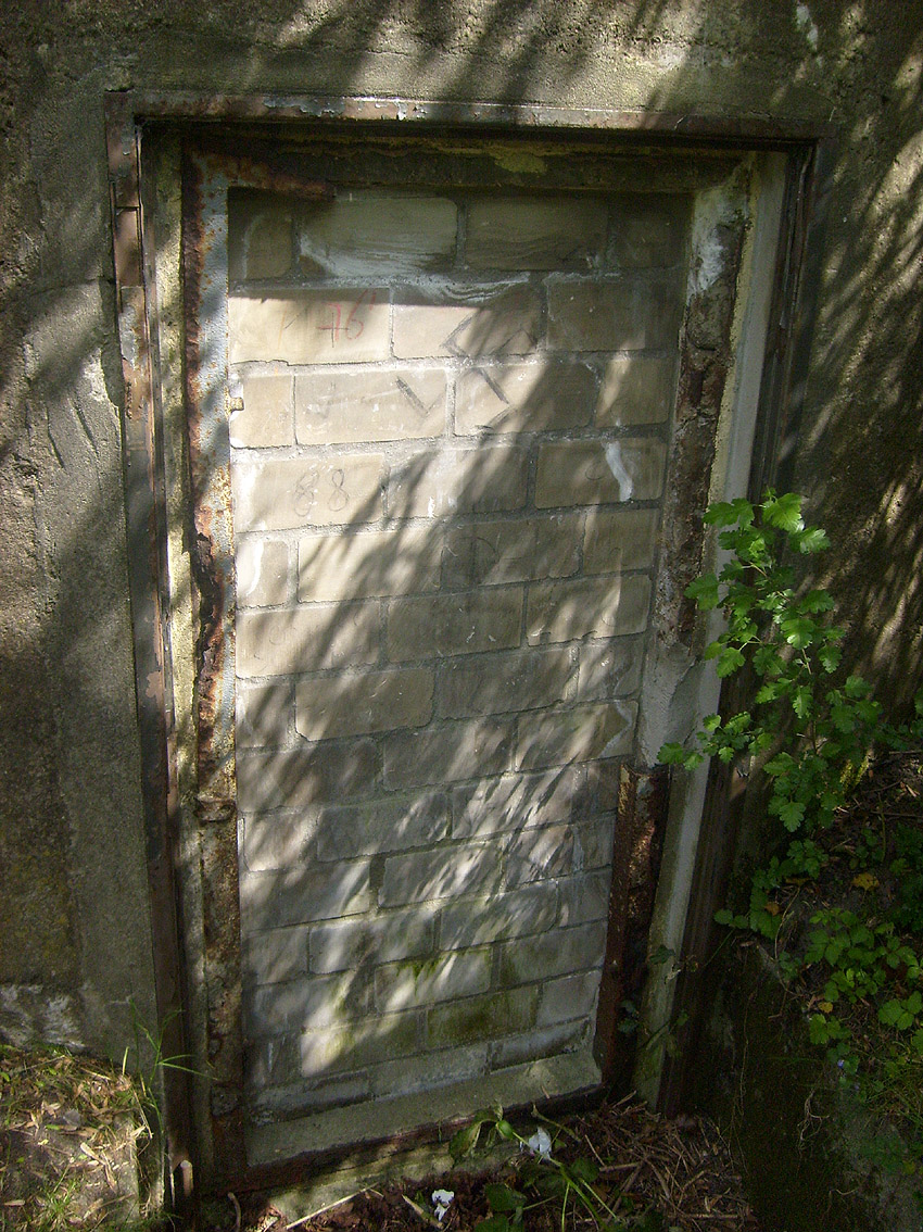 Der Betonblock im Notausstiegsbereich ist von allen Seiten verschlossen. Entweder wurde er nachträglich vor den Ausstieg gesetzt (unwahrscheinlich), oder ein, bzw. zwei seitliche Ausstiege wurden nach dem Krieg zugemauert und verputzt. Davon ist allerdings nichts mehr erkennbar... Ehemalige Öffnungen lassen sich höchstens erahnen. Oder befand sich im Block direkt vorne an der Längsseite eine Öffnung?