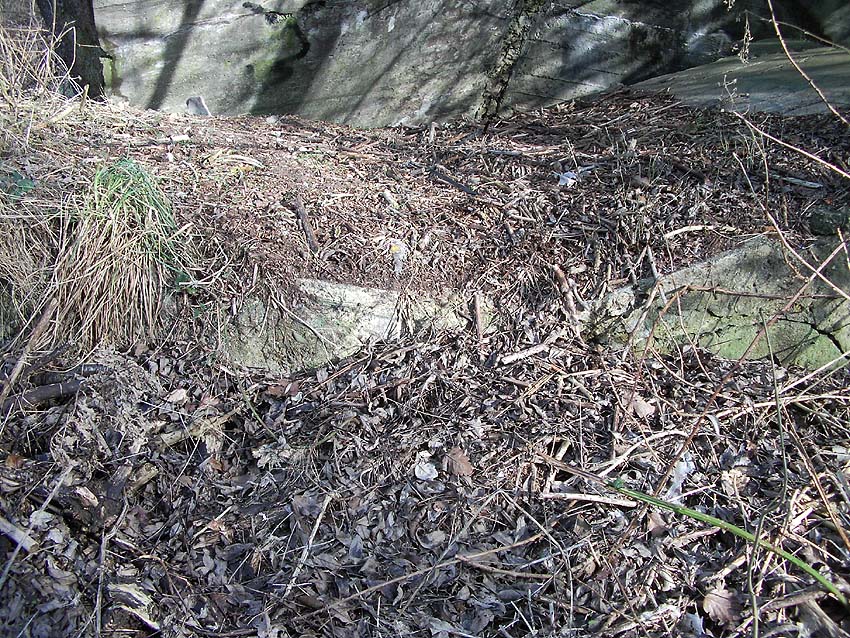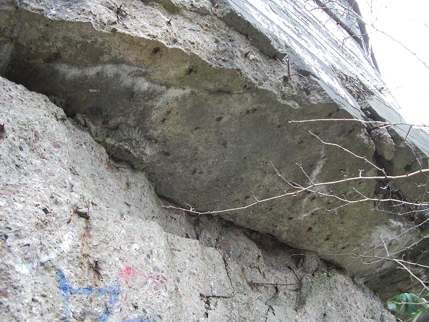 Unter dem zweiten Pfeil von links die Kuppel des gesprengten Turmes. Die Reste der (Rund)Türme 3 und 4 waren hier bereits scheinbar großteilig entfernt (größerer Bildausschnitt nach links hin liegt vor). Dies dürfte damit zusammenhängen, dass diese spärlicher bewehrt waren und die Trümmer somit leichter beseitigt werden konnten. Auch die Sprengung selbst dürfte diese Türme in kleinere Trümmer zerborsten haben, als die anderen Exemplare im Banter Lager.