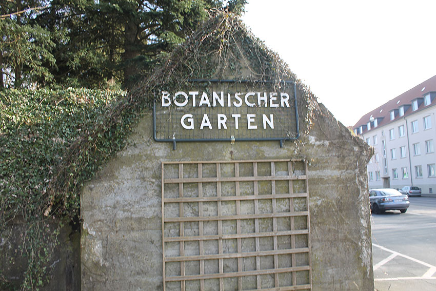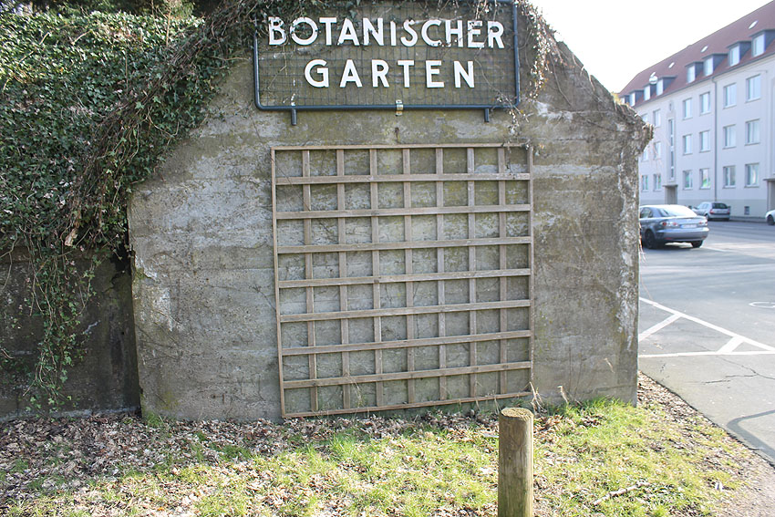 "Auf dem Gelände des ehemaligen Botanischen Gartens stehen noch zwei Bauwerke aus der Zeit vor dessen Gründung. Nämlich zwei betonierte Deckungsgräben der damaligen Grodenschule. Nördlich und südlich an der Geländebegrenzung. Die Grodenschule stand bekanntlich mittig versetzt nach Osten hin. Davor der ehemalige Schulgarten, welcher später einmal der Botanische Garten wurde. Die Schule selbst ist 1944 großteilig zerbombt worden. Die Schutzbauten retteten Menschenleben, hier Kinder und Lehrkräfte. Nach der Zerstörung des Schulgebäudes sind aber auch vermehrt Anwohner der umliegenden Wohnbereiche in die Anlagen geströmt, als die Sirenen heulten. Sie bilden als Sonderbauten des damaligen Luftschutzes in ihrer eigenwilligen Bauform einen festen Bestandteil der bewegten Stadtgeschichte.
