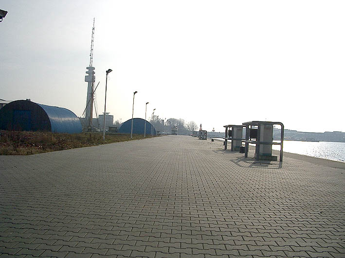 Das im Vordergrund erkennbare Schiff wurde in der Kriegsendphase als Wohnschiff genutzt. Der nahe LS-Turm Hafeninsel rechts davon wurde großteilig von der Besatzung als Schutzraum während der Bombenangriffe aufgesucht.