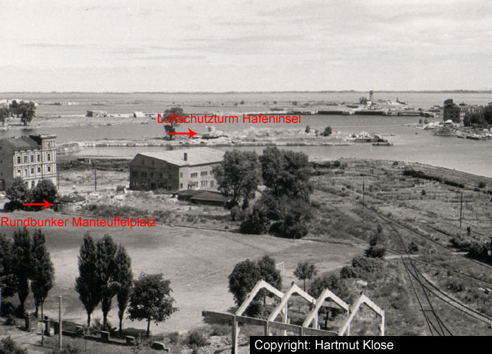 Links Splitterschutzunterstand / rechts gesprengter LS-Turm Hafeninsel: