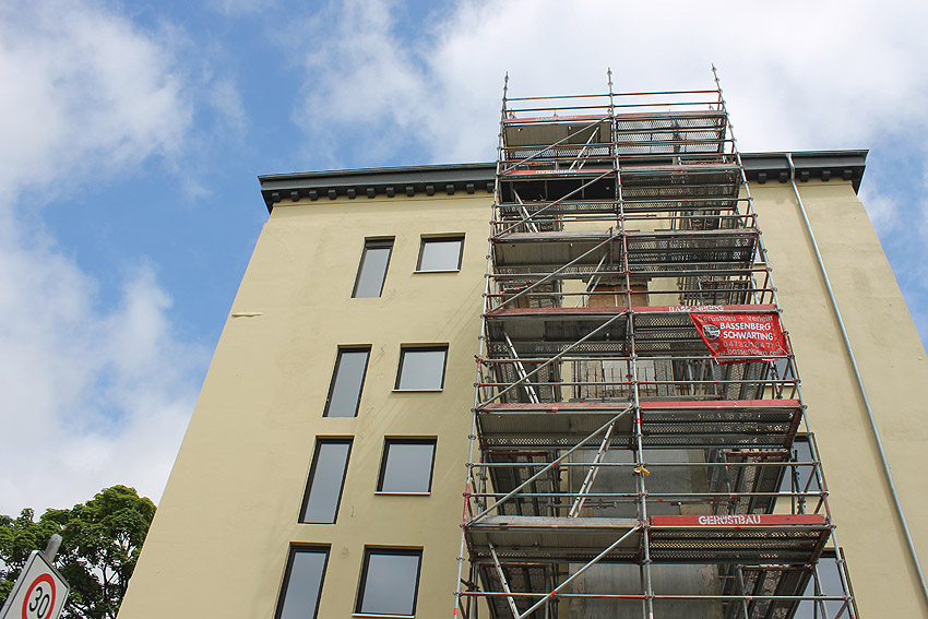 30. August 2019: Es tut sich nun wieder was. Der gesamte Bunker ist eingerüstet und Fassadenarbeiten schreiten voran.