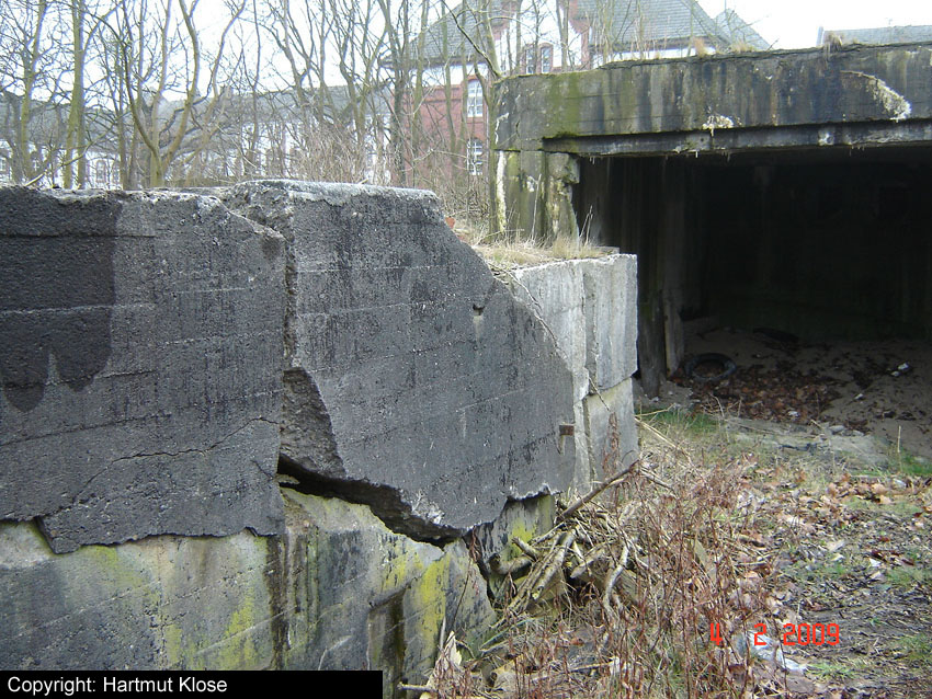 Teilbereiche der alten Werftmauer mussten aufgrund Baufälligkeit mittlerweile entfernt werden. Nun ist der Südostbereich des Bunkers von der Straße aus gut zu erkennen. Am dortigen Eingang hängt seit längerer Zeit (mindestens seit 2004) ein BW-Tarnnetz: