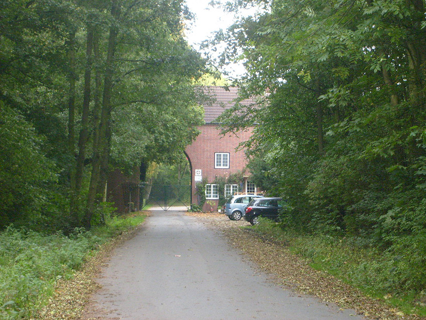 Dieses Bild zeigt den getarnten und verklinkerten Bunker Rosenhügel zwischen 1941 und 1945. Erkennbar ist der nach dem Krieg gesprengte Bereich des Beobachterturmes mit leichter Flakstellung, aufgenommen vom Torbogen des Eingangsbauwerkes zur Flakleitstelle.