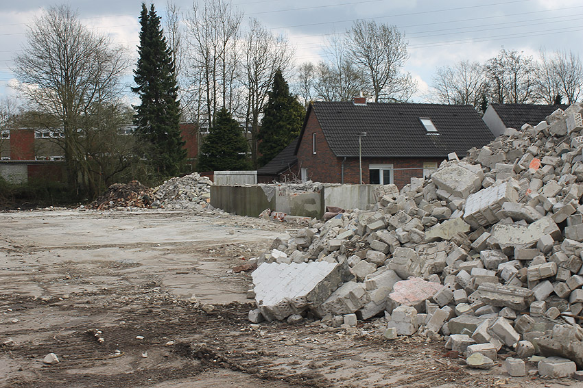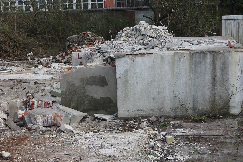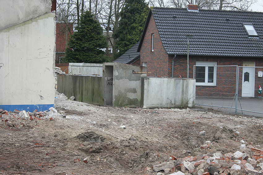 Der kleine Schutzbau Rüstersieler Straße 67 befindet sich seit gestern, 15. April 2016, im Abriss. Der Eingangsbau ist bereits zerstört, ebenso ein Teilbereich der Decke. Damit verschwindet wieder ein Relikt, das man ohne Mühe hätte als Anschauungsobjekt erhalten können. Gestört hätte allein platzmäßig das kleine Bauwerk für das Neubauvorhaben bestimmt nicht...