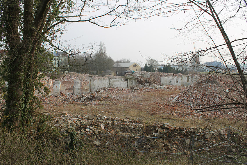 10.04.18: Die Schuttbeseitigungsmaßnahmen waren bereits seit Wochen großteilig wieder ausgesetzt. Kurz vor deren kompletter Aussetzung wurde noch das letzte erhaltene Teilstück des ehemaligen Wohntraktes- Wirtschaftstraktes der Südzentrale in Richtung K.W.-Brücke planiert. Wir berichten hier weiter.