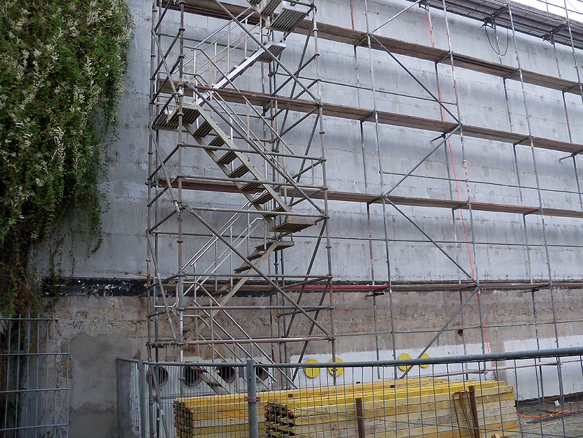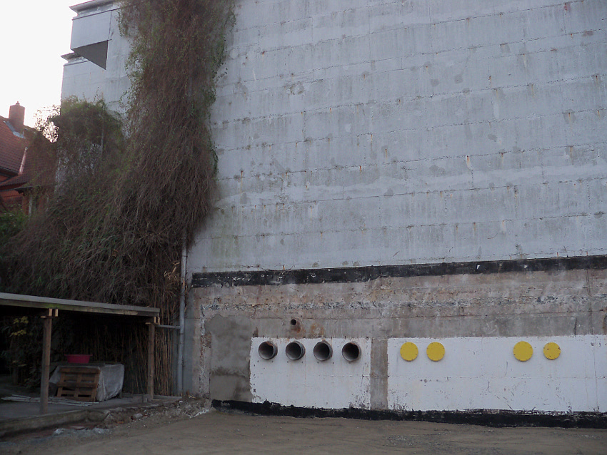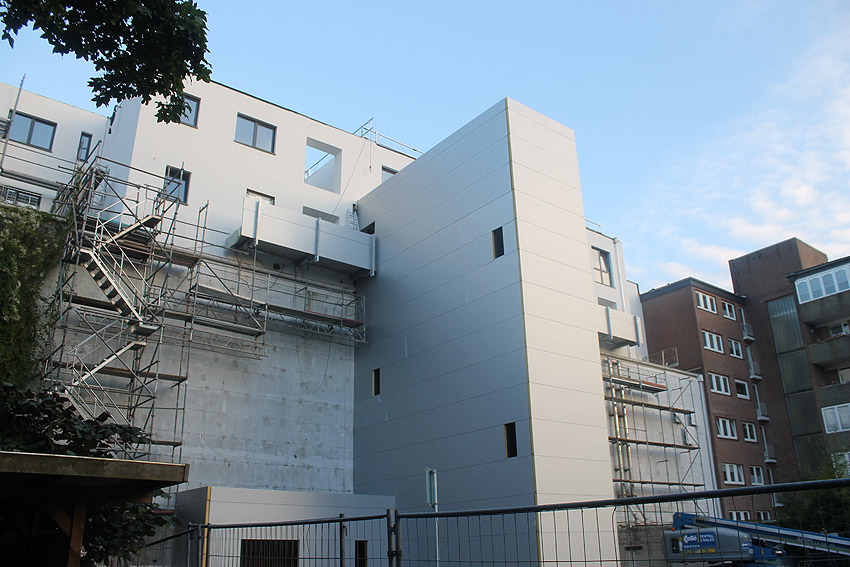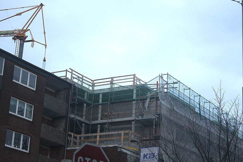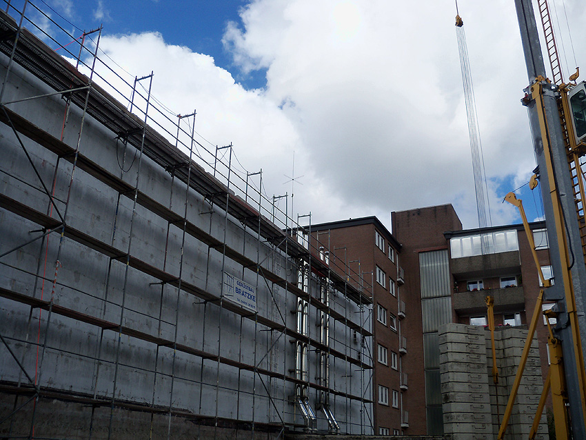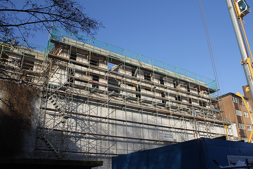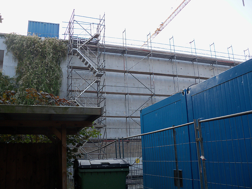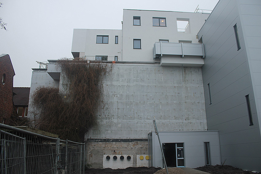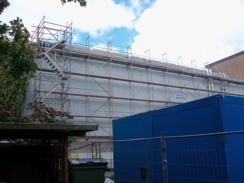 Am ehemaligen OP-Bunker Virchowstraße wird nun an der rückwärtigen Ostwand der Treppenhaus- und Fahrstuhlanbau für die aufgebauten Wohnungen errichtet. Wo genau der Fahrstuhl installiert wird, ist uns allerdings noch etwas unklar. Die Arbeiten gehen stetig weiter ihrer Vollendung entgegen.