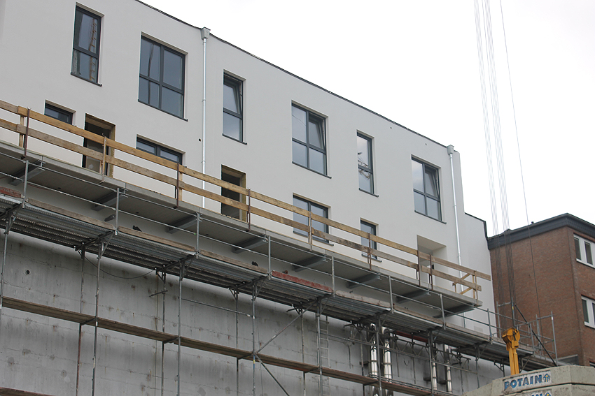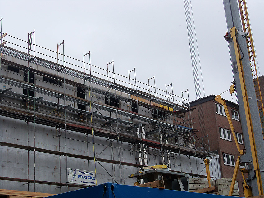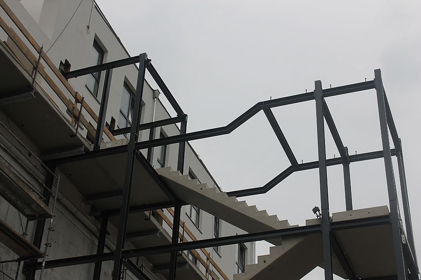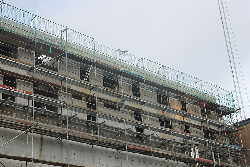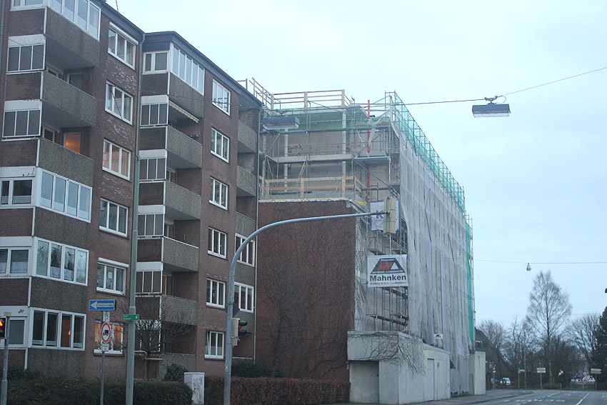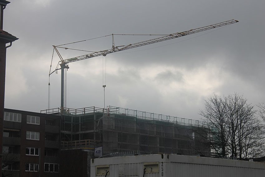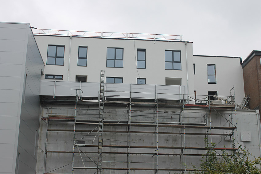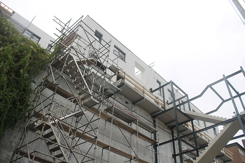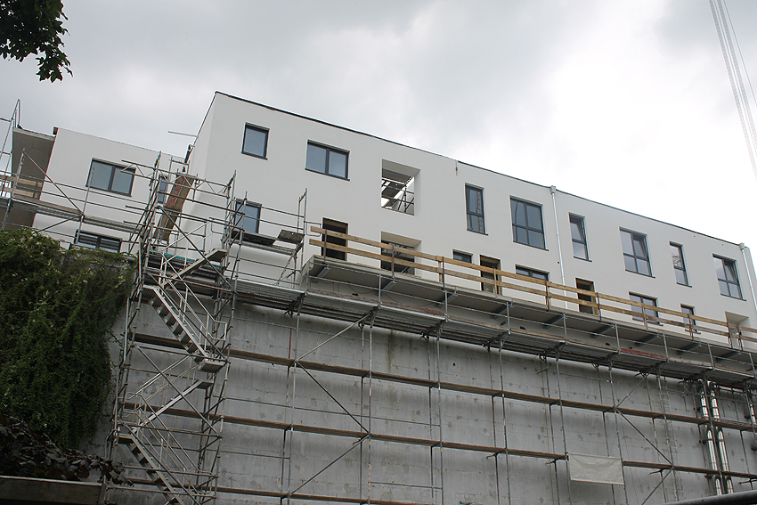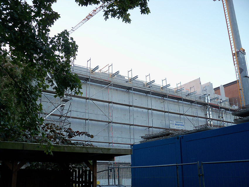 Am ehemaligen OP-Bunker Virchowstraße wird nun an der rückwärtigen Ostwand der Treppenhaus- und Fahrstuhlanbau für die aufgebauten Wohnungen errichtet. Wo genau der Fahrstuhl installiert wird, ist uns allerdings noch etwas unklar. Die Arbeiten gehen stetig weiter ihrer Vollendung entgegen.