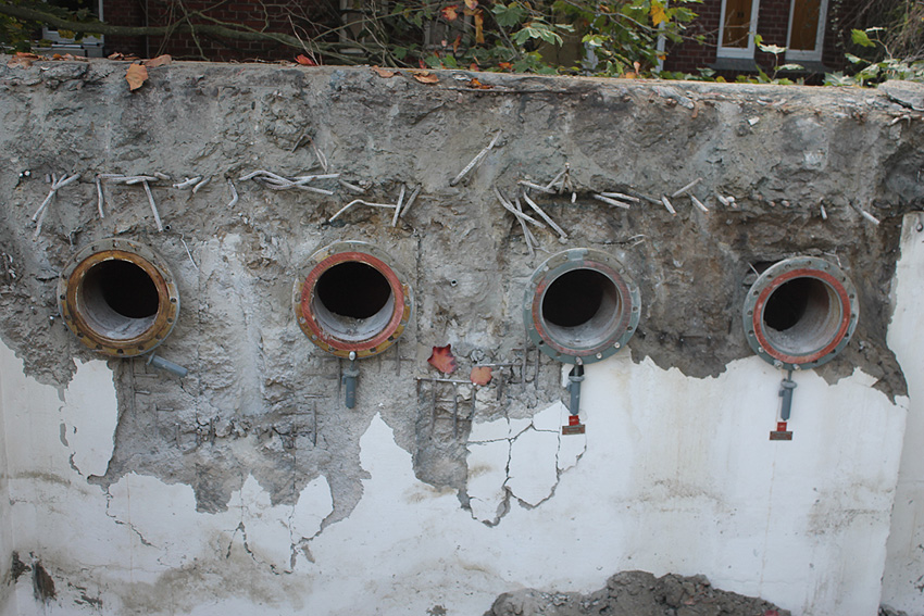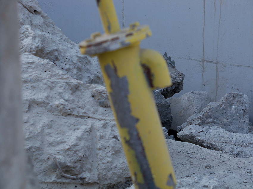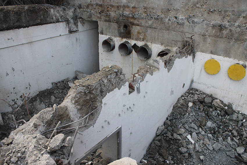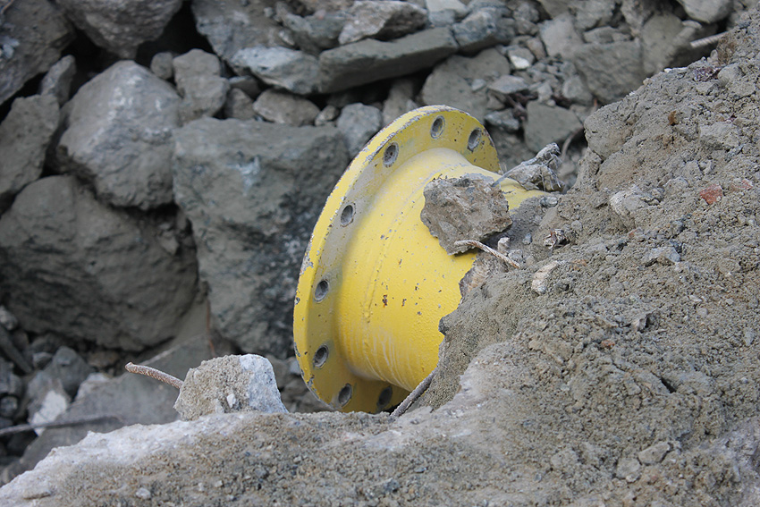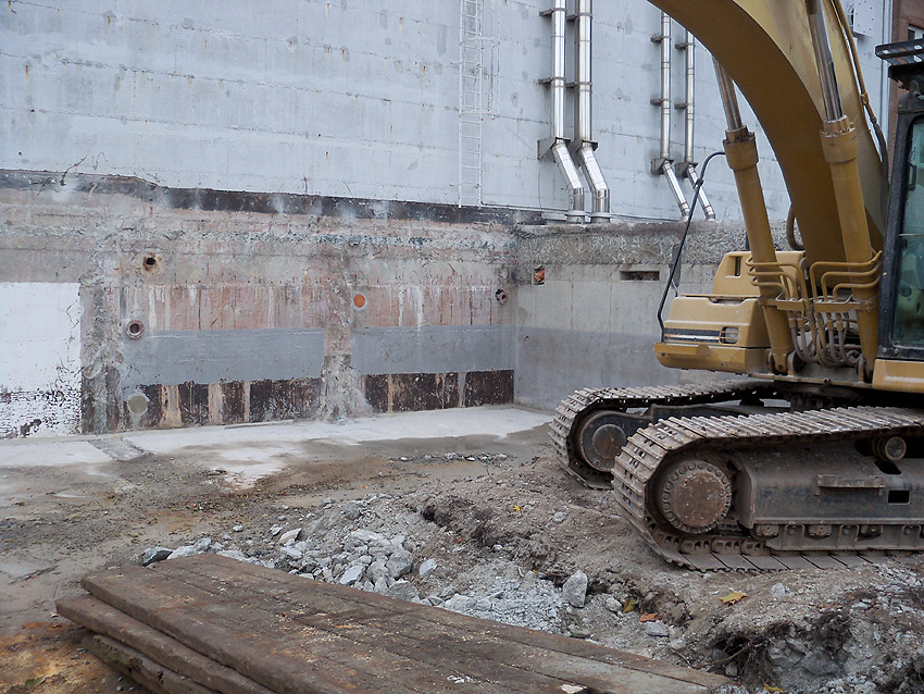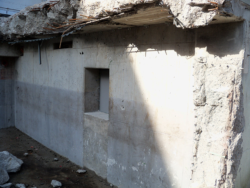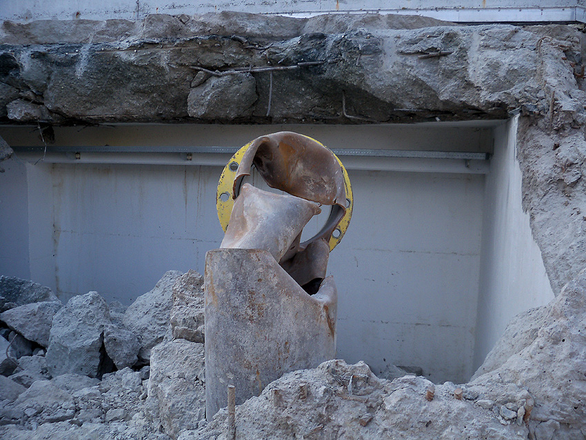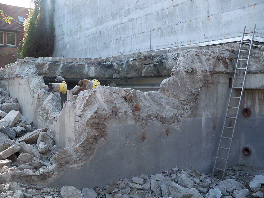 Hier im Hintergrund an der Hauptbunkerkörperwand letzte Reste der ehemaligen Ziegelrot-Tarnbemalung der Wände, geschützt lange Zeit vor der Witterung durch den nachkriegszeitigen Anbau (Zivilschutzbindung). Der Beginn vom Ursprungsanbau befand sich genau rechts an der Baggerschaufel.