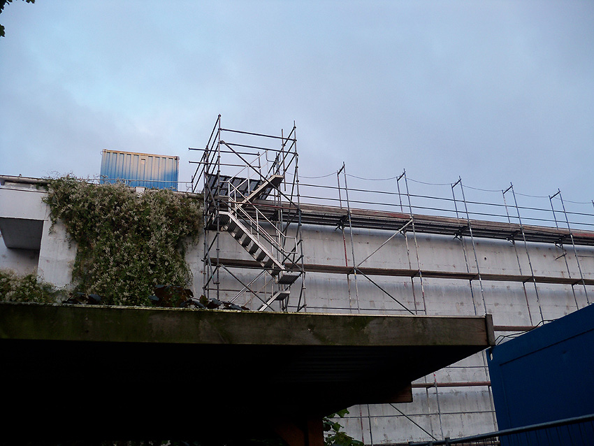 Nach Wochen wieder Aktivität von außen zu erkennen: Am Hochbunker Virchowstraße schreiten die Bauarbeiten für den Überbau langsam auch äußerlich sichtbar wieder voran. Wann der Anbau mit Treppenhaus und Aufzug jedoch installiert / angesetzt wird, ist uns noch unbekannt.