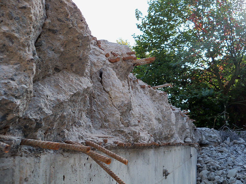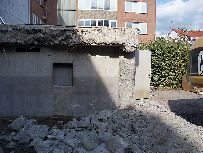 Am ehemaligen OP-Hochbunker Virchowstraße rücken die Abrissarbeiten des Vorbaues aus Nachkriegszeiten dem Ende entgegen. Der Nordbereich des Vorbaues bleibt erhalten. Wir berichten weiter. Wir haben nachgesehen: Der Originalvorbau schloß genau an der Nordwand des Nachkriegsvorbaues ab, besaß die gleiche Höhe wie dieser und fand seine Südbegrenzung genau dort, wo der jetzt erhalten bleibende Nachkriegsvorbaurest seine Südbegrenzung zeigt.