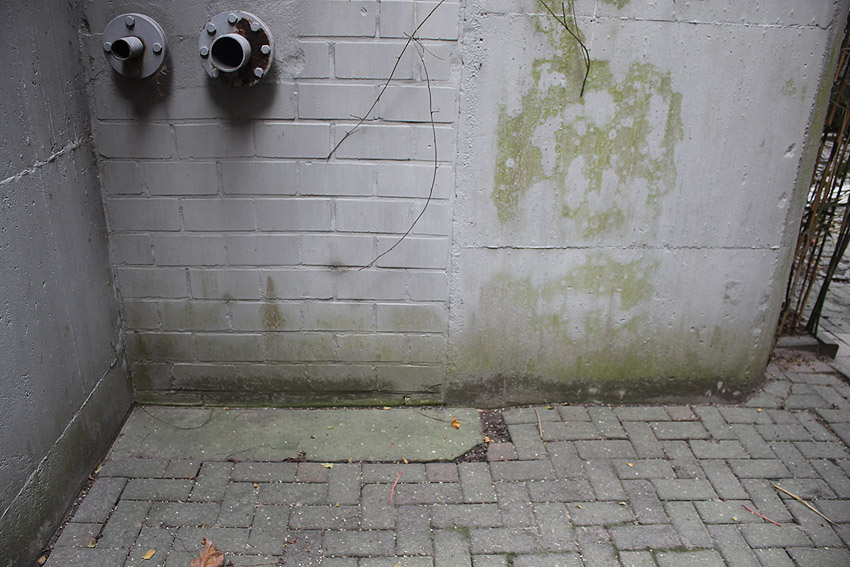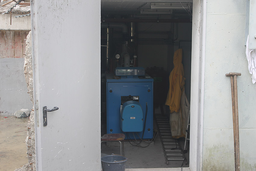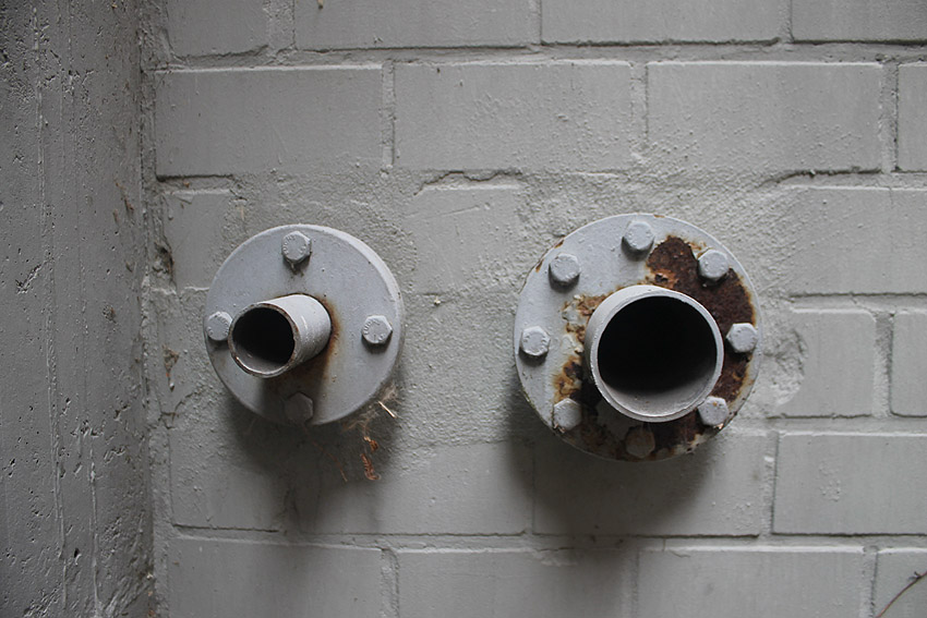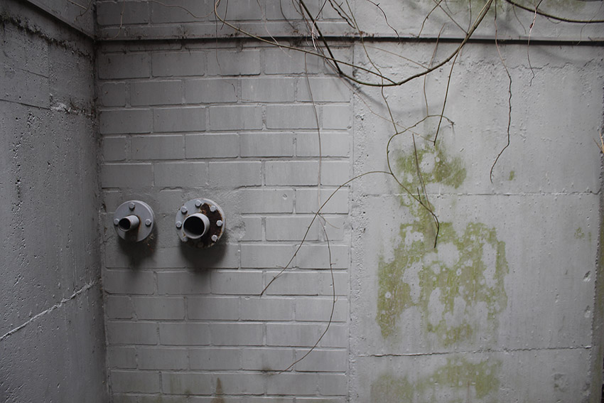 Dies dürfte der ehemalige Brunnenraum sein. Auf dem Boden zu sehen höchstwahrscheinlich der Hydrant-Anschluss für den darunter liegenden Tiefbrunnen.