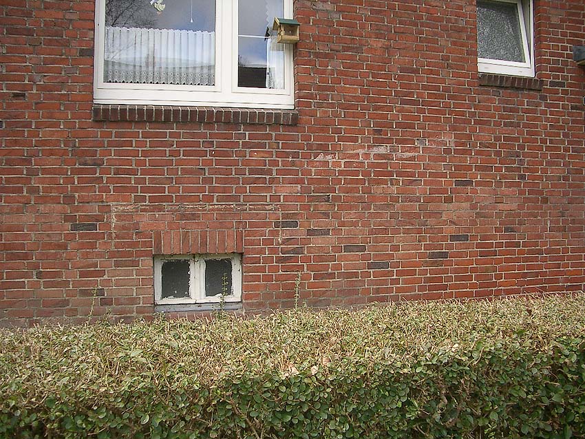 Auch vor den nachfolgend abgebildeten ehemaligen LS-Kellerfenstern waren wie vor diversen anderen Kellerfenstern im Stadtgebiet Betonblöcke gelagert worden. Sie sollten Schutz vor Detonationsdruck bieten. Auch auf den nachfolgenden Bildern sind Reste der Putzfugendichtung teilweise noch gut zu erkennen...