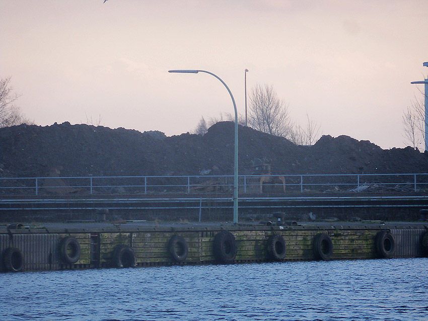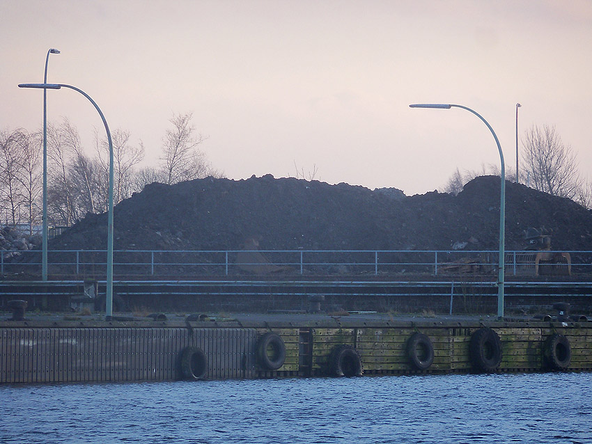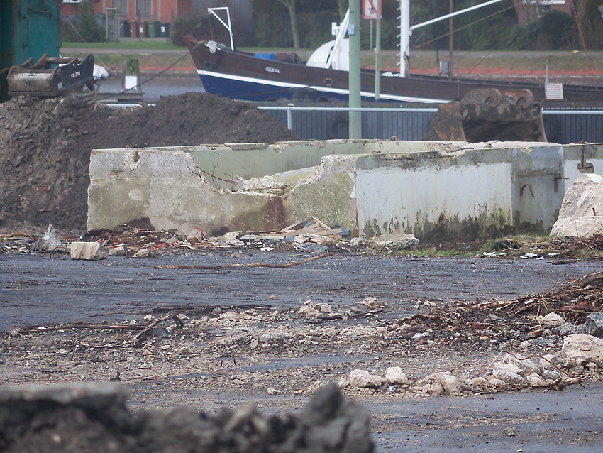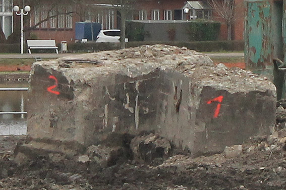 Nachtrag 14. Februar 2018 zum Objekt 2: Das westliche beider "Quadrate" bestand aus zwei nebeneinander gesetzten massiven 3,50 Meter tiefen Betonquadern (unbewehrt). Der Bereich wurde am 7., 8. und 9. Februar 2018 abgebrochen. Eventuell handelte es sich dabei um eine Art Fundament für einen Lastenkran. Vielleicht sogar um eine Art Schwerbelastungs-Testkörper?