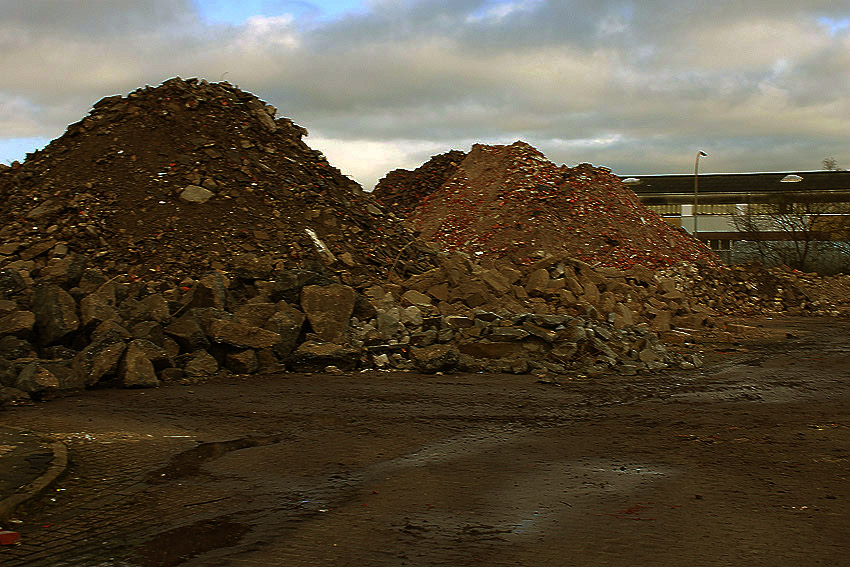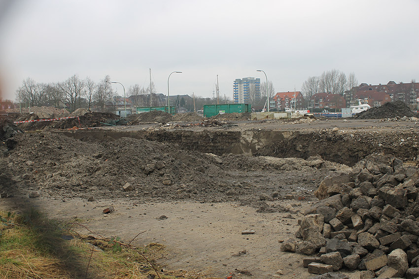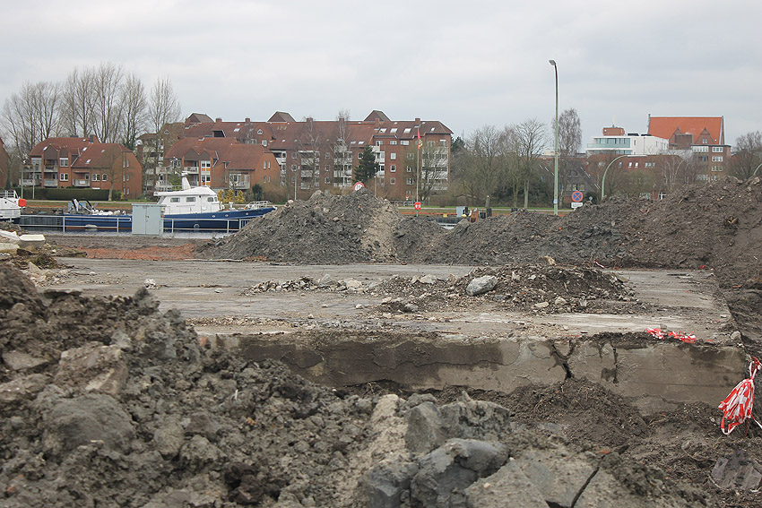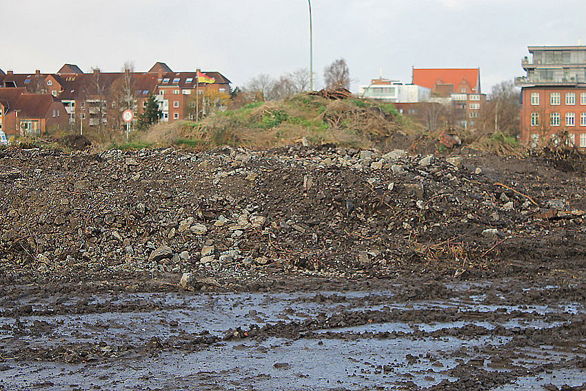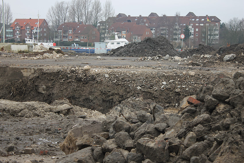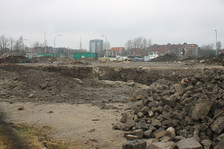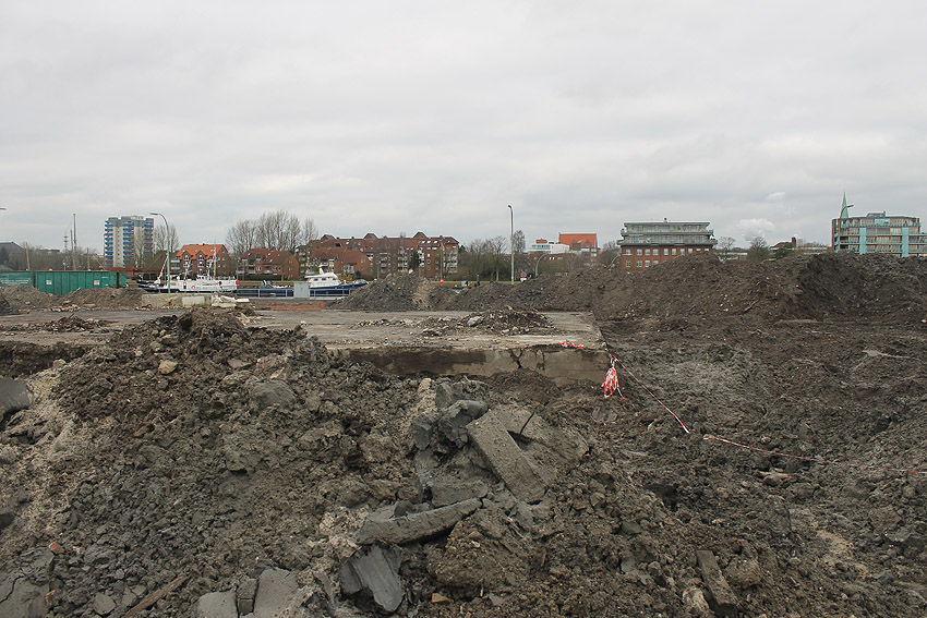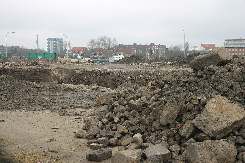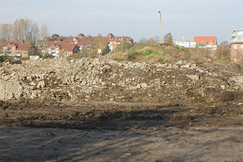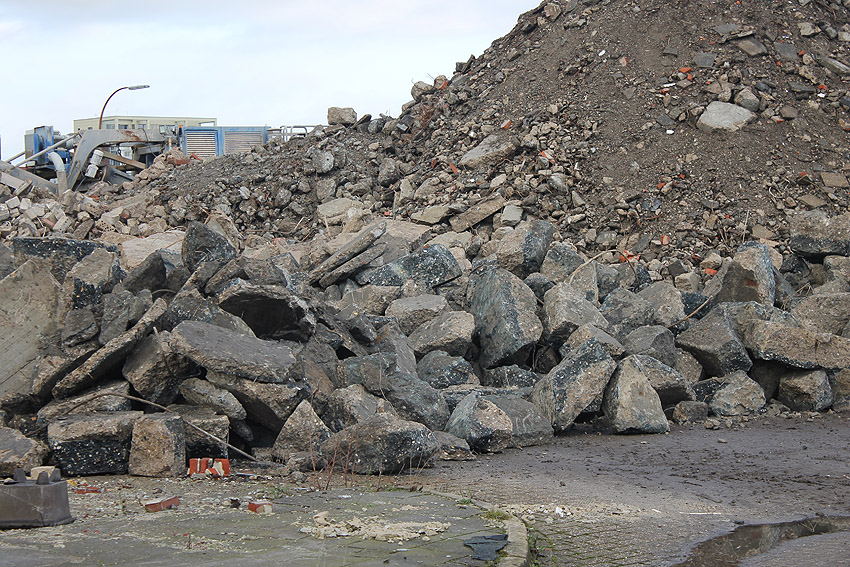 Alles ist abgerissen bis auf den Tiefbunker. Gewaltige Betontrümmer der Nachkriegsbauten-Fundamente türmen sich auf dem Gelände.