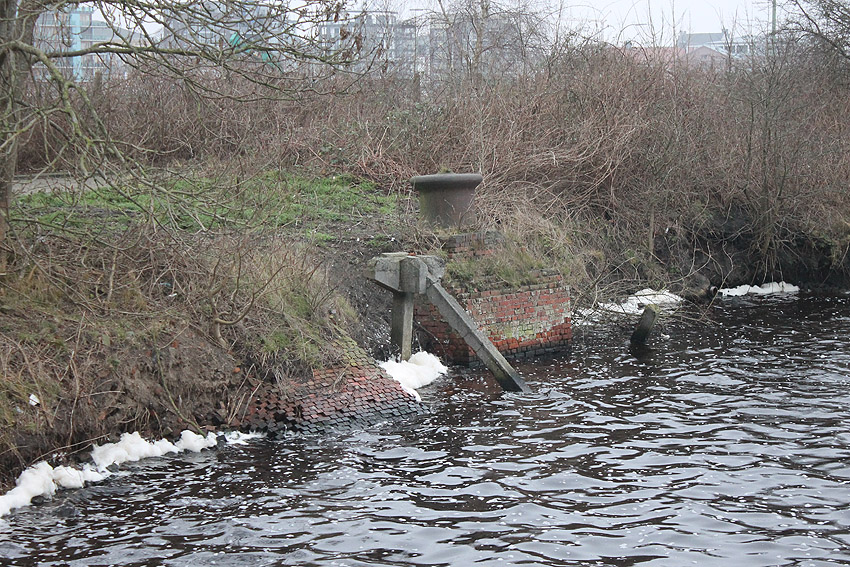 Einige Meter südlich des Objektes am Geländezaun befindet sich diese unter Wasser stehende Öffnung, die mit einer Stahlklappe (im Bild ganz unten zu sehen) versiegelt war. Besteht hier eventuell ein Zusammenhang?