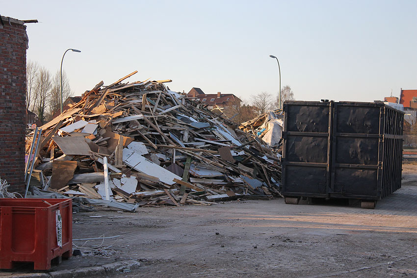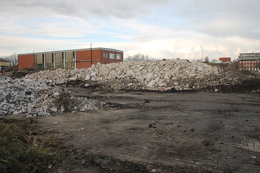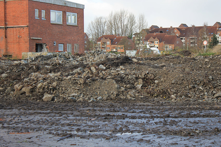Das am Tiefbunker anliegende Heizwerk-Gebäude wurde bis auf den Schornstein abgerissen. Die Gebäudetrümmer lagern nun zunächst auf der Bunkerdecke.
