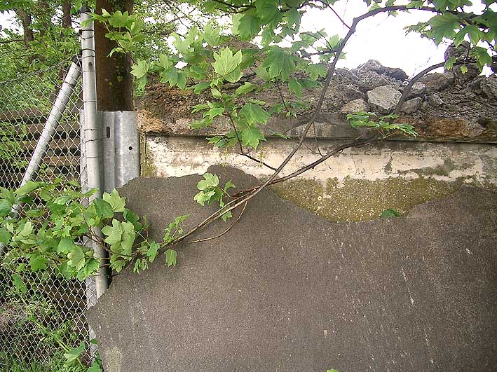 24.05.06: In nur drei Tagen wurde ab Montag bis heute fast der gesamte noch vorhandene Rest des betonierten Deckungsgrabens zerkleinert. Zwei Betonbrockenberge des anfallenden Schuttes sind inzwischen aufgetürmt. Nach den zögerlichen ersten Abrisswochen kann man sagen, dass nun "ganze Arbeit" geleistet wurde. Man sieht wieder einmal, es lag wohl doch nicht an der Technik sondern an anderen "Hürden". Vielleicht war diese Abrissdauer auch geplant. Jedenfalls wird in einigen wenigen Etappen wohl (über Erdgleiche) nichts mehr an den Graben erinnern.