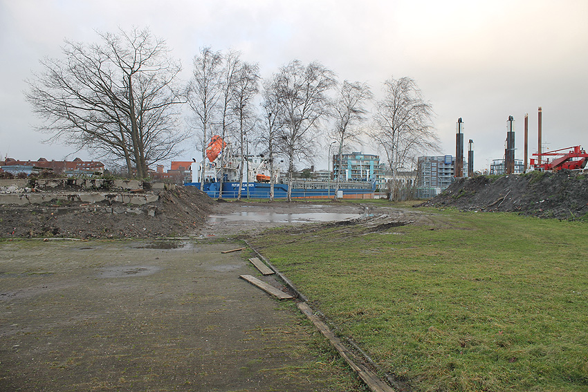 Deichstraße / damaliges Marine-Materiallager: Heute ist der Bunker komplett zertrümmert worden. Damit endet seine Geschichte. Zuvor war die an und über ihm befindliche Halle abgerissen worden. In den Bunkerresten ist zu erkennen, wie immens viele Stahlträger zur Verstärkung der Festigkeit der Anlage verwendet worden sind. Hier