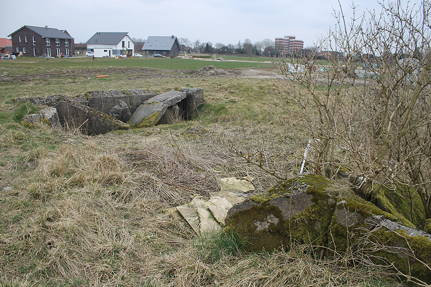Das ist alles, was von der damaligen Flakstellung Jever-West blieb. Die Stellung war bis in die heutige Zeit noch gut erkennbar gewesen. Bis auf den nördlichen externen Munitionsbunkerrest wurden sämtliche Relikte planiert. Hier entsteht ein Neubaugebiet. Ein weiteres Zeitzeugnis der Regionalgeschichte ist damit Vergangenheit. Hier