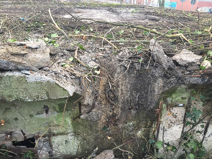 Schwere Flakbatterie Kirchreihe (südlich Stadtpark): Kürzlich traten massive Reste des gesprengten Maschinenbunkers an dessen Westseite wieder ans Tageslicht, als ein dortiger Kleingarten renoviert wurde. Hier