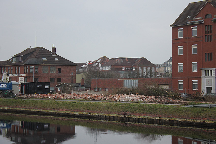 Bunker Am Handelshafen / bei Deichstraße 1: Der kleine Bunker wurde am Mittwochvormittag, 8. März 2023, innerhalb von nicht einmal zwei Stunden im oberirdischen Bereich gänzlich abgerissen. Dabei trat der mit Wasser gefüllte Innenraum ans Licht. Der Wasserstand stieg durch hineinfallende Trümmer. - Erhöhte sich später aber weiter merklich. An der Westwand trat im ehemals kleinen Nebeninnenraum eine Leitung ans Tageslicht. Am 9. März füllte sich der Innenraum, der mittlerweile von diversen Trümmern geräumt war, weiter. - Diesmal mit einer schwarzen Flüssigkeit, wohl ölbelastet, aus den höchstwahrscheinlich vorhandenen Leitungen zum Bunkerpumpwerk an der Deichbrücke nach Osten hin. Die (Nachkriegs...) Vermauerungen eben wohl dieser Leitungen wurden durch die Abrisstätigkeiten zerstört, so dass hier wohl nun eine Wasser-Maschinenölmischung hineinlief... Vorsicht ist diesbezüglich umweltschutztechnisch geboten: Eine weitere Verbindung vom (ehemaligen) Bunkerbereich befindet sich an der Südseite zum Hafen hin. So etwas passiert, wenn sich Verantwortliche vorher nicht richtig informieren. Der Abriss geschah ohne Vorankündigung. Damit ist wieder ein Stück Geschichte Wilhelmshavens verschwunden.