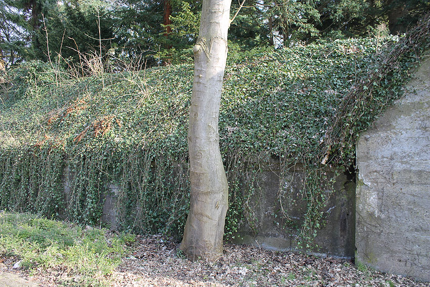 Dieser Deckungsgraben scheint aus zwei Bauelementen zu bestehen. Hier zu sehen ist die Trennungskante. Vielleicht hat diese Tatsache etwas mit den Erschütterungen bei Nahtreffern und der Länge des Bauwerkes zu tun. Hierdurch könnten Brüche im Beton als Pufferzone vermieden worden sein. Theoretisch müssten dann alle betonierten Deckungsgräben der Stadt diese Trennungsstellen aufweisen.