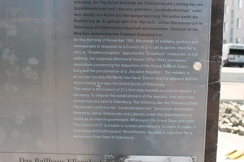 Kurios ist, dass hier das historische Elisenlustgebäude 2019 abgerissen wird, ein wichtiger Ort gerade auch im Hinblick auf den Matrosenaufstand. 2018 Aufstellung eines Denkmales für einen Ort, ein Gebäude, was ein Jahr später dann planiert wird. So etwas muss erhalten bleiben. Aber da reden wir gegen Betonköpfe...