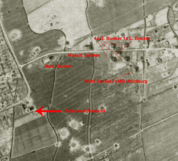 Nicht auf dem oberen Bild: Der Scheinwerferstand südwestlich der Stellung. Ein paar Meter südöstlich von Geschützbunker Süd-Ost ist ein Objekt erkennbar. War dies eventuell ein weiterer Scheinwerferstandturm? Es könnte sich aber auch (was wahrscheinlicher ist) um den verbunkerten Sockel des FuMG Würzburg ("Würzburg-Riese") handeln, das in diesem Bereich installiert war. Noch heute ist in einem dortigen Kleingarten eine Erderhöhung von etwa einem Meter - mit Länge von circa 8 Metern und Breite von ungefähr 6 Metern - vorhanden, die nachträglich mit einer Betonplatte für eine Gartenhütte versehen wurde.