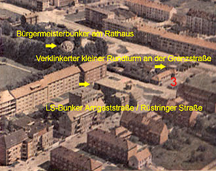 Gleich drei dieser zweigeschossigen Rundschutzbauten aus Mauerwerk mit Stahlbetonabschlussdecke / Zwischendecke wurden konzentriert hier im Bereich Grenzstraße auf Geländen von kleinen Werksbetrieben erbaut. Abgelöst wurden diese Bauten durch die bekannten eingeschossigen Stahlbetonrundschutzbauten mit Spitzkuppel. Hätte es diese Ablösung erst später gegeben, oder vielleicht gar nicht (unwahrscheinlich), ist zu vermuten, dass diverse weitere der zweigeschossigen Mauerwerksrundtürme im Stadtgebiet errichtet worden wären.