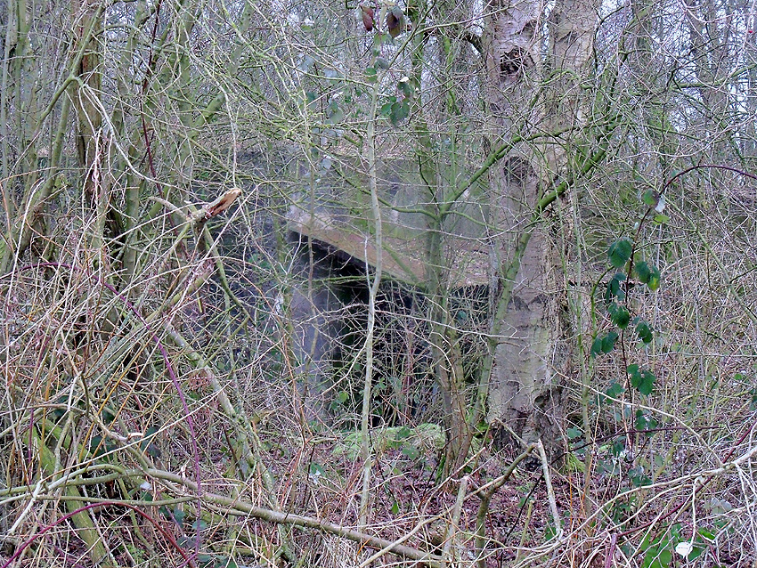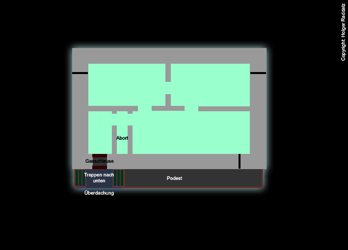 Interessant ist, dass bei diesem Bunker ein zweiter Eingang, beziehungsweise Notausgang nicht vorhanden war. Es kann natürlich sein, dass ein eventueller zweiter Eingang nachträglich versiegelt wurde. Bloß fehlt eine zweite Gasschleuse, es kann dann lediglich eine Notausstiegsluke oder ähnliches gewesen sein...