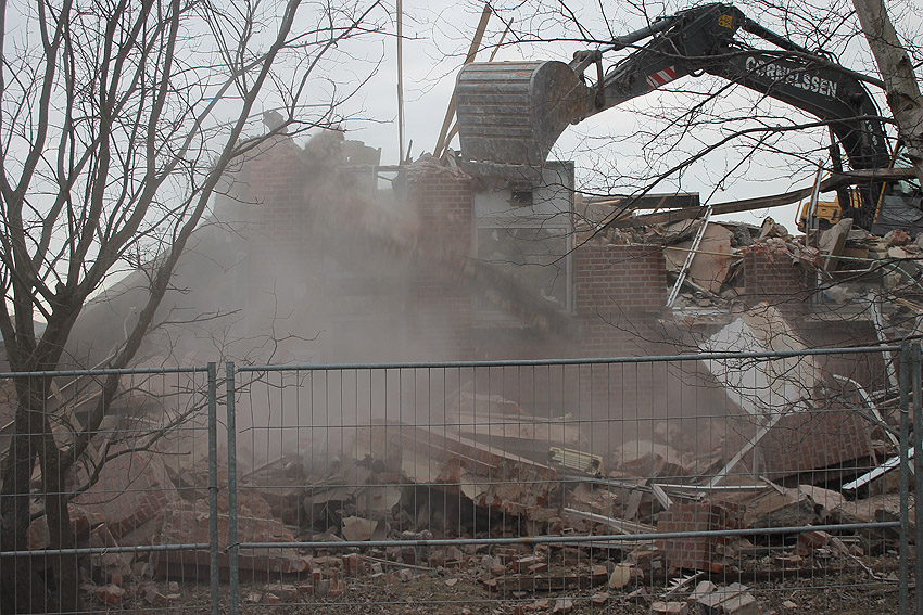 19. Februar 2014: Das Gebäude kann mit dem heutigen Tage als abgerissen gelten. Mit ihm auch die LS-Kellerreste, obwohl am Nachmittag noch ein ehemaliger LS-Stahlklappen-Rahmen als letztes Zeugnis erkennbar war.