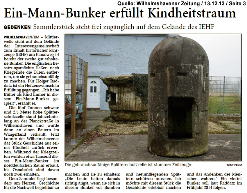 13.12.13: In der Wilhelmshavener Zeitung wurde heute über die Rückführung der Splitterschutzzelle von Klein Rhaude nach Wilhelmshaven berichtet.