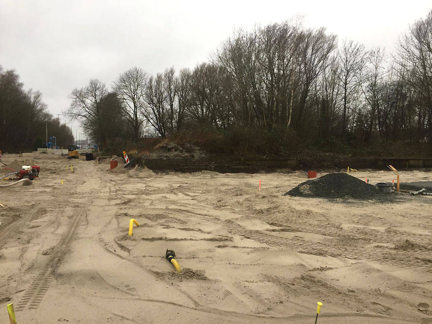 Der gesamte Parkplatz ist erneuert / umgewandelt worden zu einer Stellfläche wohl für Schwerfahrzeuge und ein neues großes Tor wurde an Stelle des alten Tores in die Geländeumzäunung eingebaut.