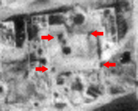 Der Tiefbunker schien entweder die Form eines "U" gehabt zu haben, oder aber das Gebiet in der Bildmitte war abgesenkter als der Bereich an den auf dem Bild ersichtlichen vier Eingangsbauwerken.
