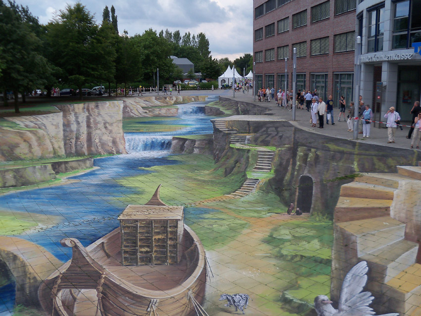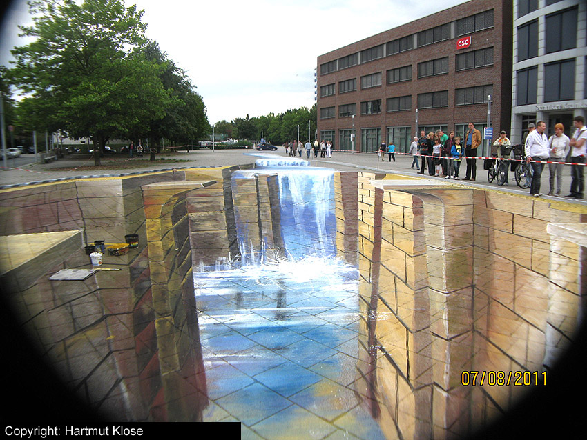 07.08.11: Unter dem heutigen Valoisplatz - da, wo sich im Krieg der Stollenbunker der Bauart Hugo Herzbruch befand, erstreckte sich dieses Wochenende eine ganz andere unterirdische Anlage gänzlich unkriegerischen Zweckes, ohne Dach und ohne Erdüberdeckung und aus (leider vergänglicher) Farbe auf den Platz gemalt. Im Rahmen des Street-Art-Festivals entstand dieses eindrucksvolle Bild auf dem Standort des ehemaligen Herzbruchstollens:
