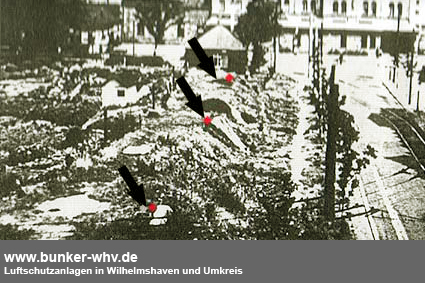 Zu erkennen ist hier der südliche runde Hauptbunkerkörper während der Abbrucharbeiten. Auch dieser Herzbruchstollen verfügte wie die Anlage am Pflegeheim Banter Weg sehr wahrscheinlich über zwei runde Hauptbunkerkörper. Diese waren hier jedoch im Gegensatz zur Anlage am Banter Weg mit einem Längsgang nach hinten, in westliche Richtung, versetzt.