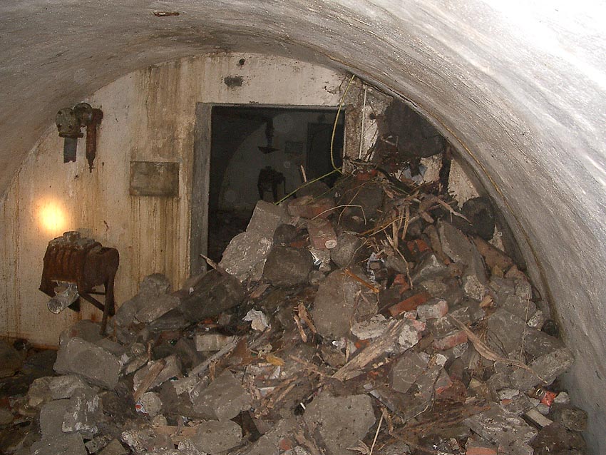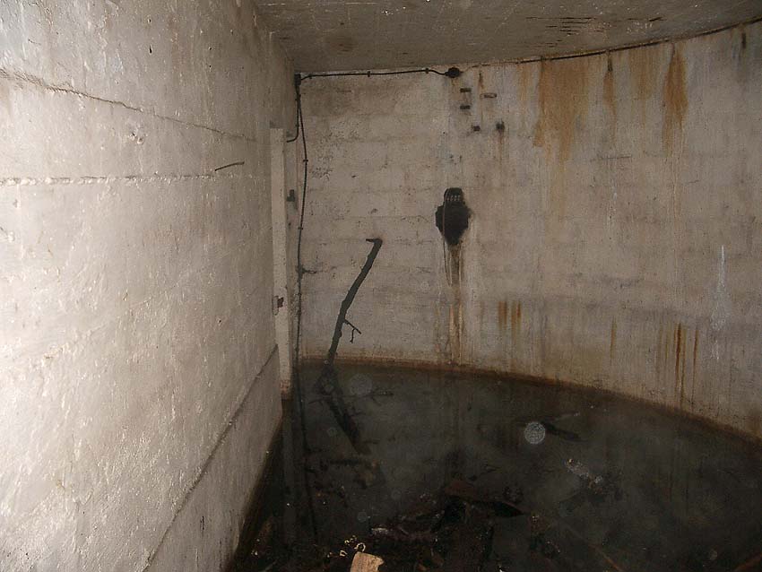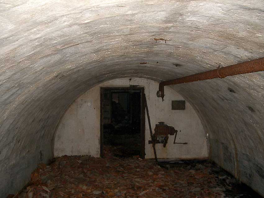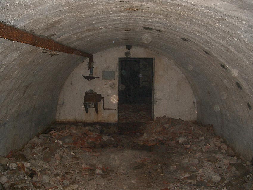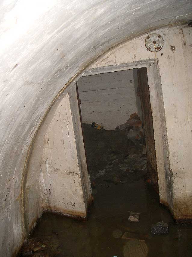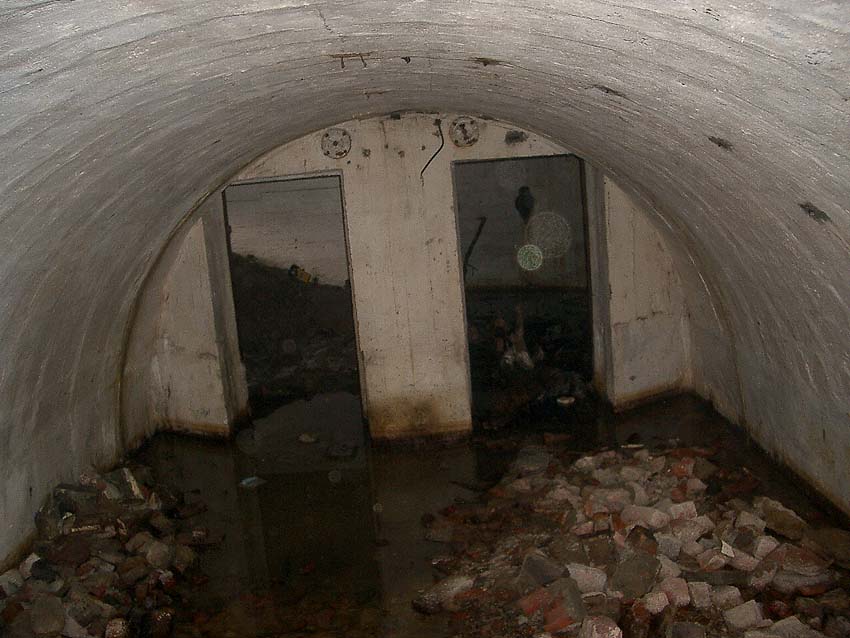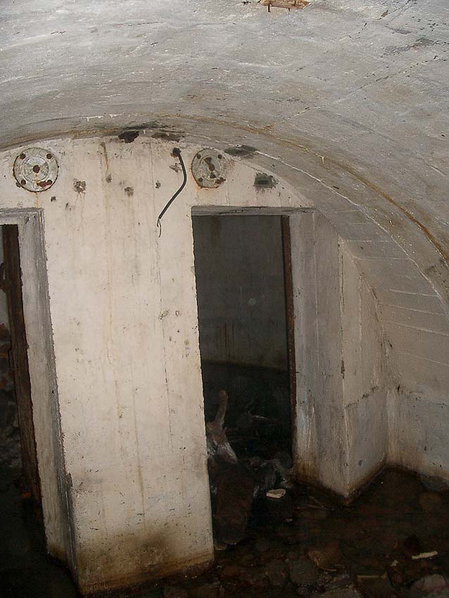 Blick zum östlichen runden Bunkerkörper, links der Aufenthaltsraum, rechts die Gasschleuse: