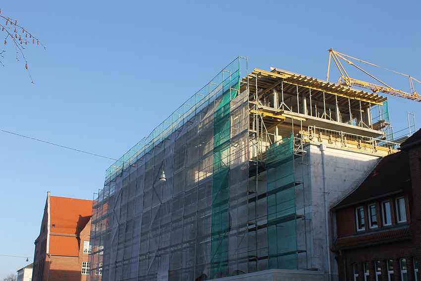 So sieht es mittlerweile am Bunker aus. Auf dem Dach sind erste Neubaustrukturen zu erkennen.