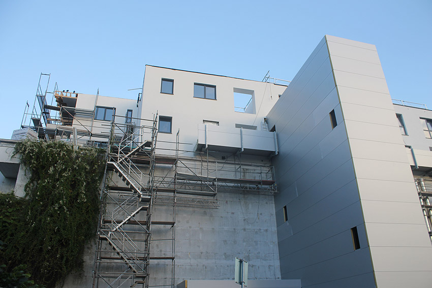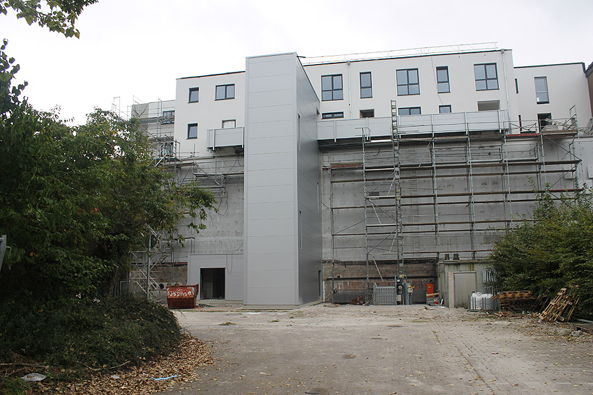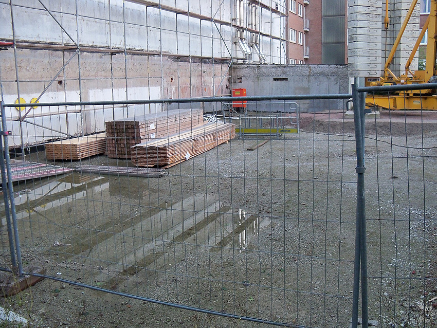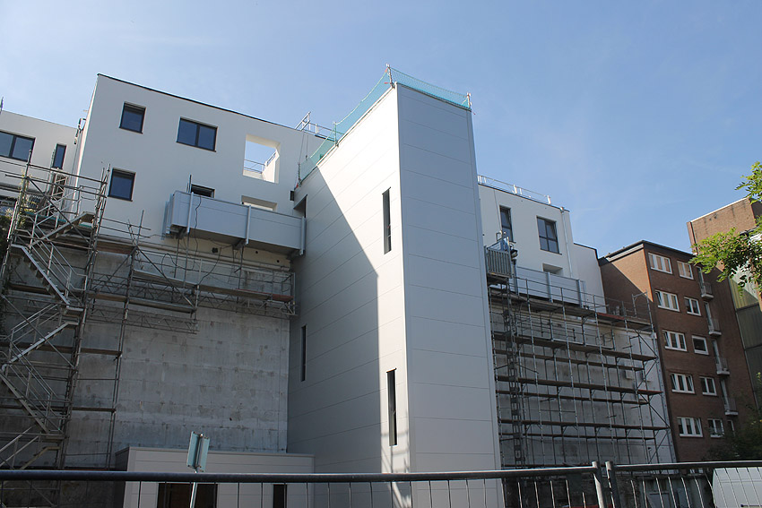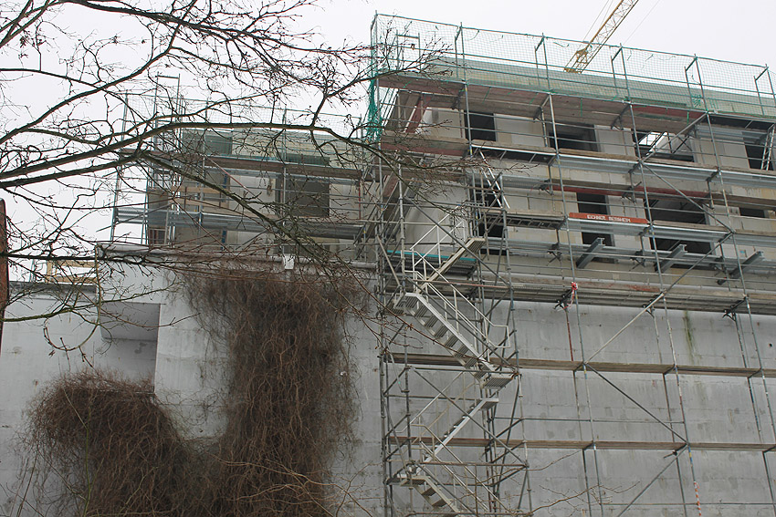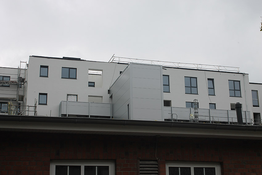 Am ehemaligen OP-Bunker Virchowstraße wird nun an der rückwärtigen Ostwand der Treppenhaus- und Fahrstuhlanbau für die aufgebauten Wohnungen errichtet. Wo genau der Fahrstuhl installiert wird, ist uns allerdings noch etwas unklar. Die Arbeiten gehen stetig weiter ihrer Vollendung entgegen.