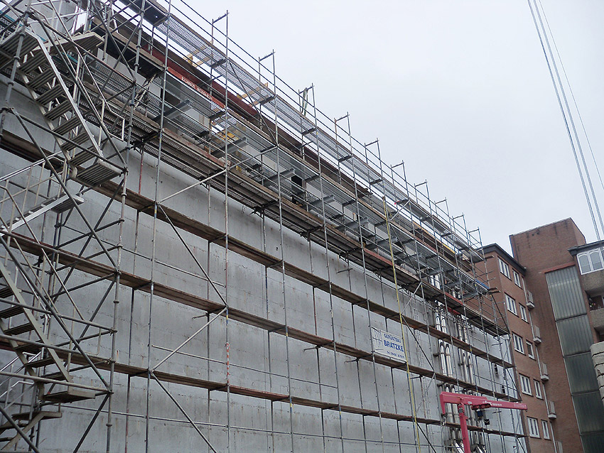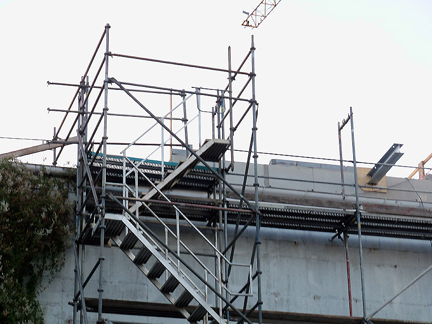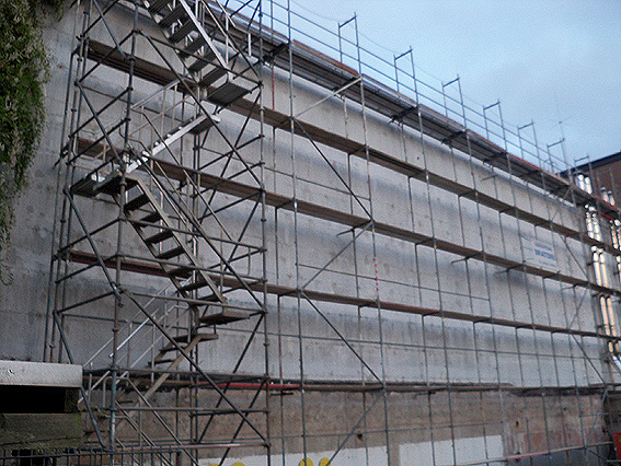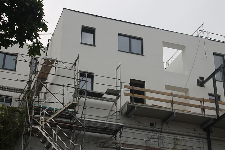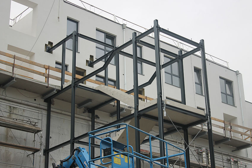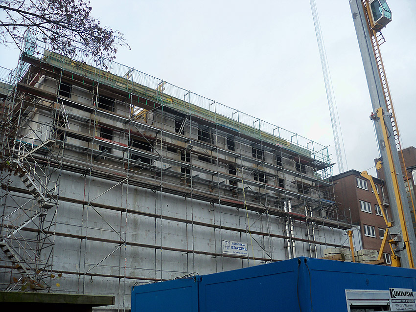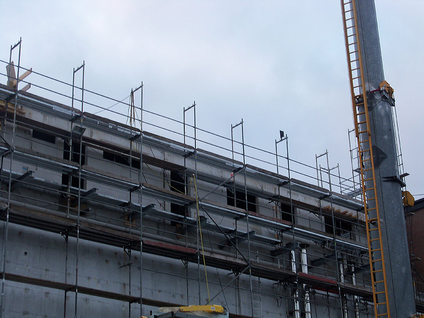 Am ehemaligen OP-Bunker Virchowstraße wird nun an der rückwärtigen Ostwand der Treppenhaus- und Fahrstuhlanbau für die aufgebauten Wohnungen errichtet. Wo genau der Fahrstuhl installiert wird, ist uns allerdings noch etwas unklar. Die Arbeiten gehen stetig weiter ihrer Vollendung entgegen.