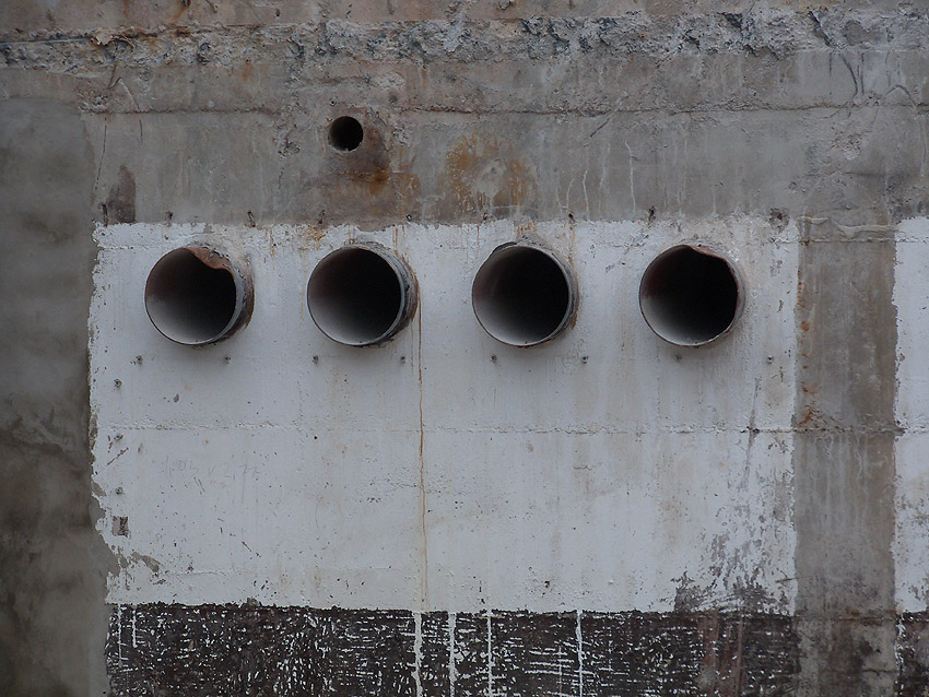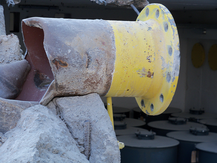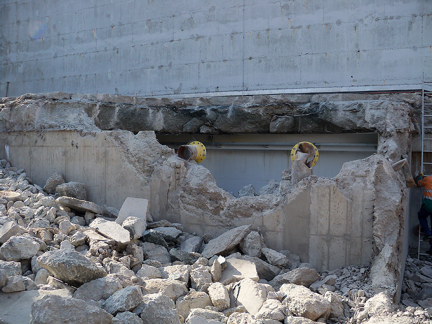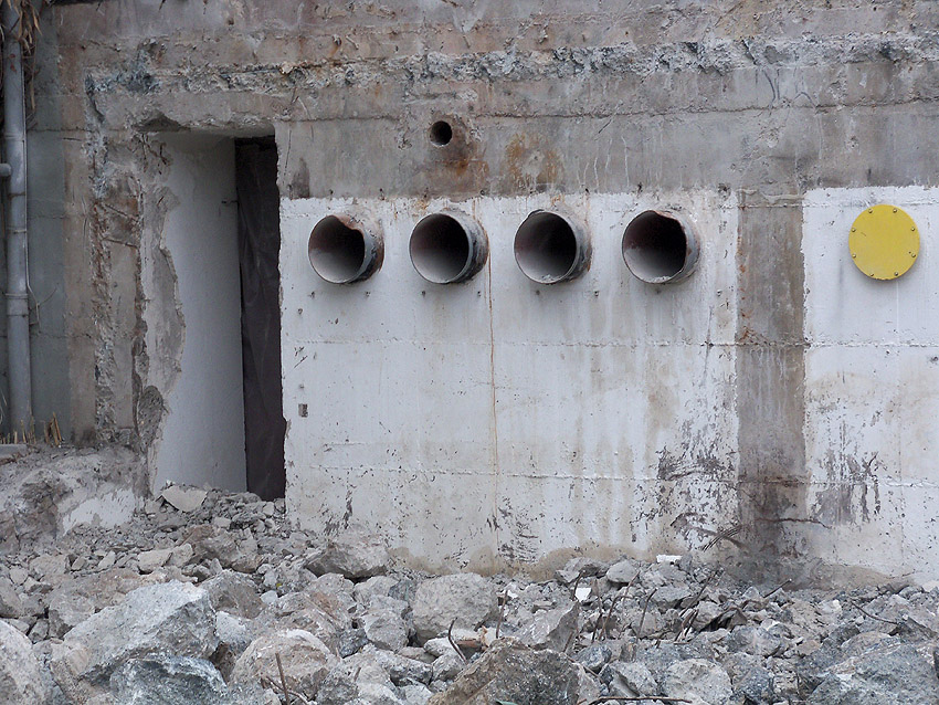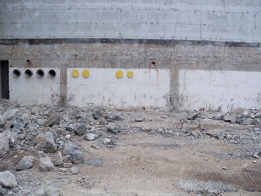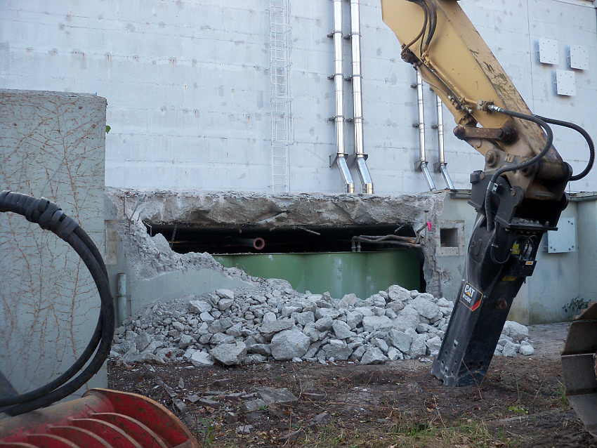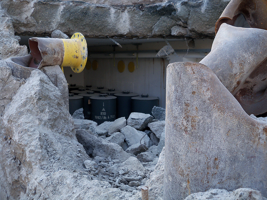 Hier im Hintergrund an der Hauptbunkerkörperwand letzte Reste der ehemaligen Ziegelrot-Tarnbemalung der Wände, geschützt lange Zeit vor der Witterung durch den nachkriegszeitigen Anbau (Zivilschutzbindung). Der Beginn vom Ursprungsanbau befand sich genau rechts an der Baggerschaufel.