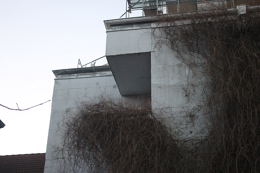 Der ursprüngliche Anbau wurde seinerzeit abgebrochen. Auf dem historischen Bild an der gesamten Bunkerwand außerdem zu sehen wenige Reste der rotfarbenen Tarnung: