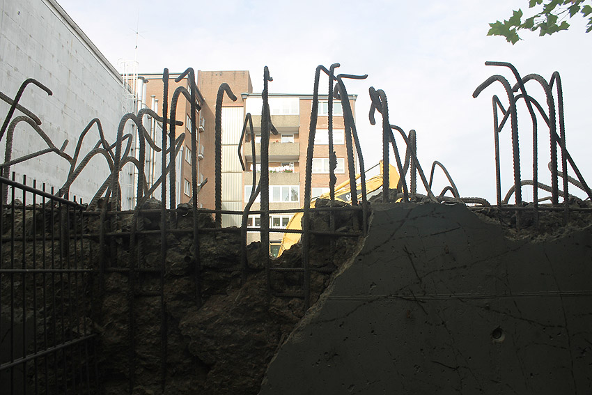Bewehrungseisen für den Wohnungsüberbau auf der Bunkerdachfläche sind mittlerweile zu sehen.