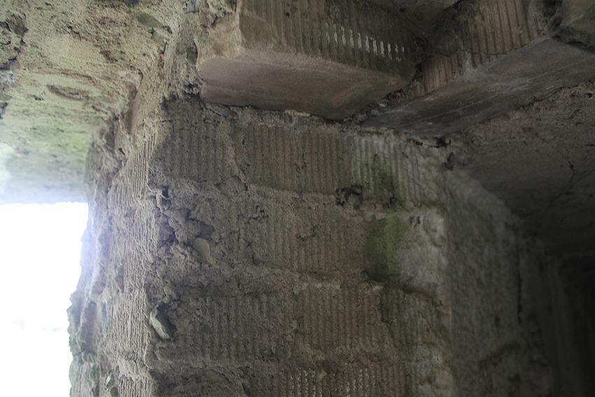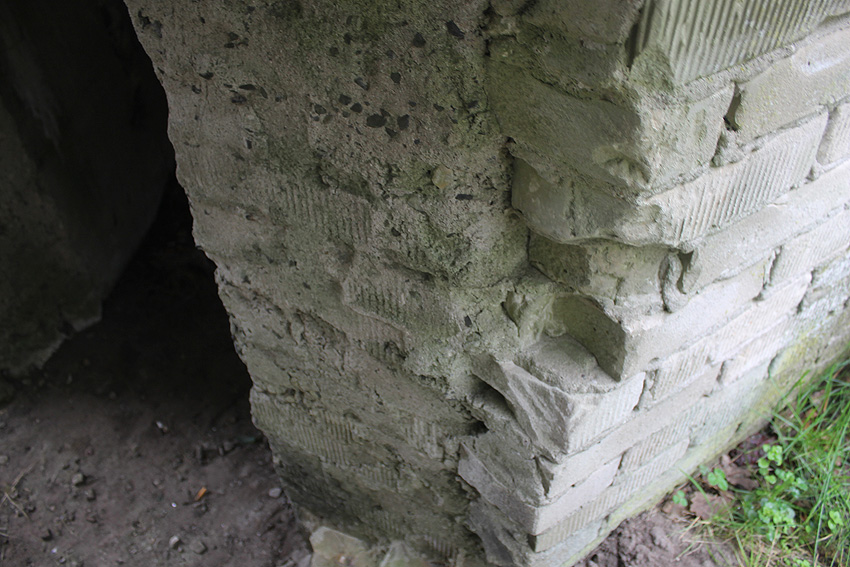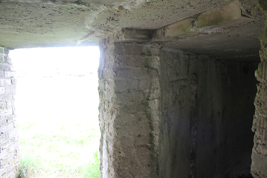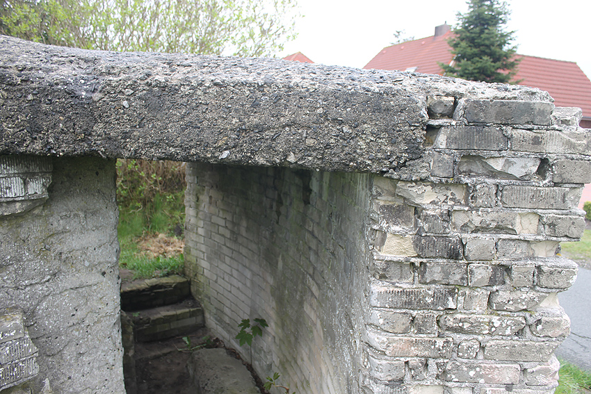Die Decke besteht aus Stahlbeton. Auf dem oberen Bild zeigen die abgeplatzten Stellen der Wandbereiche eindeutig, dass hinter dem Mauerwerk eine Betonwand liegt, wie auch im Inneren des Baues zu erkennen ist. Die Konstruktionsweise ist bei diesem Objekt besonders gut zu ersehen. Es kann davon ausgegangen werden, dass auch die anderen Rundschutzbauten dieser Art im Bereich Ardorf wie auch im Friedeburger Gebiet derartig aufgebaut sind.