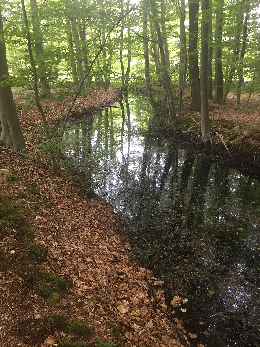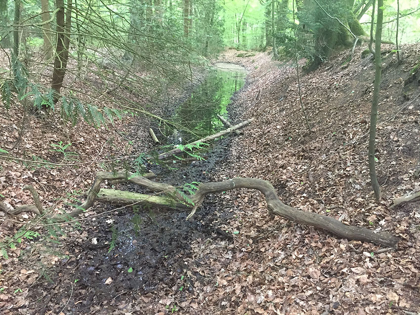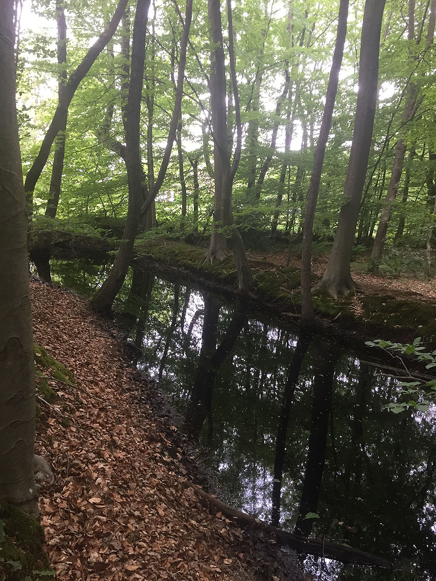 Die letzten Panzergrabenreste mit Gedenkstätte im Sandhorster Wald einige hundert Meter westlich der Bunker. Aufnahmen vom 26. Mai und 9. Juni 2023: