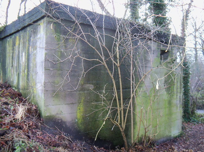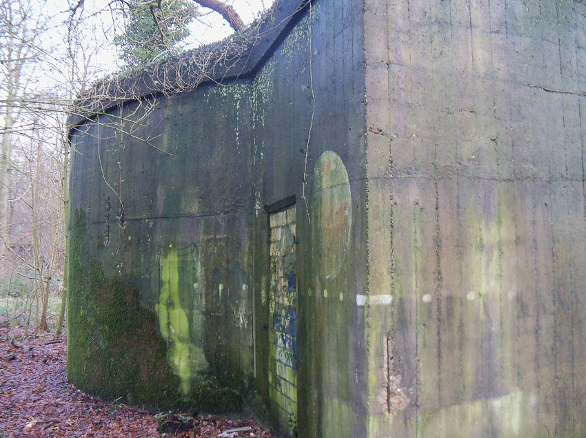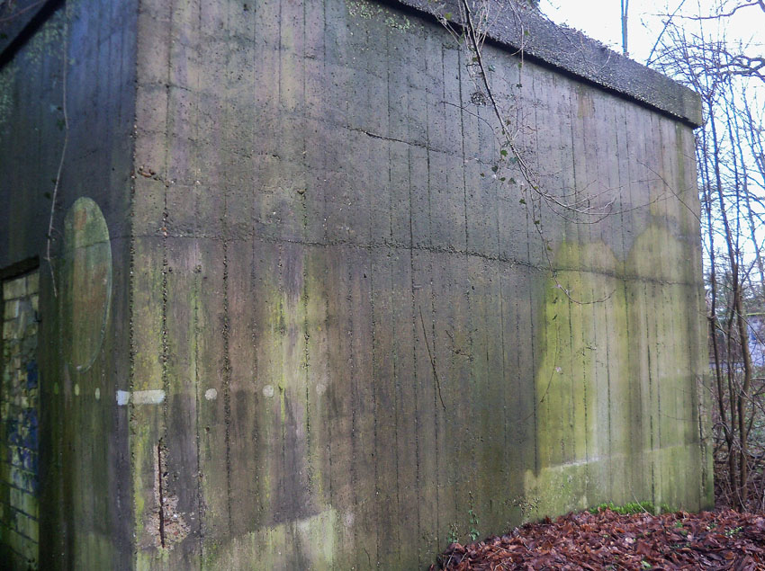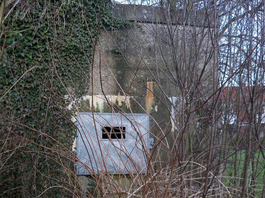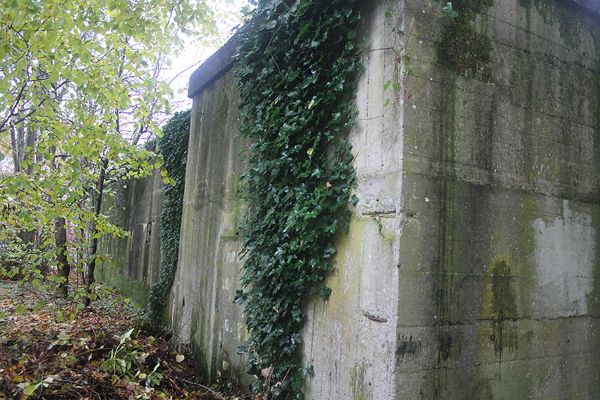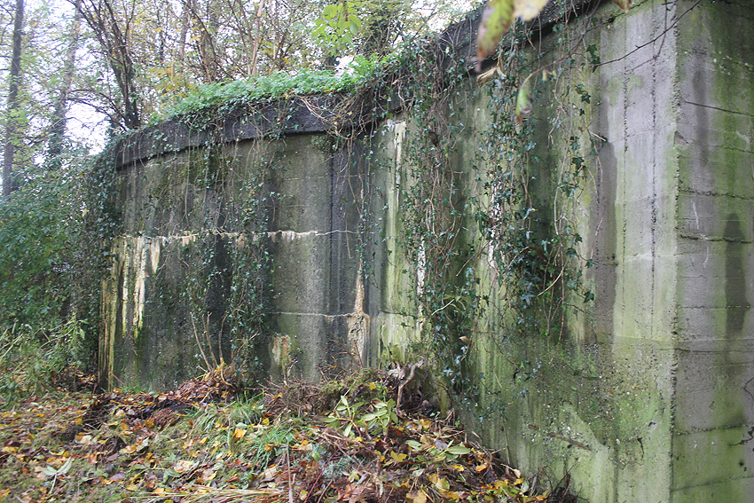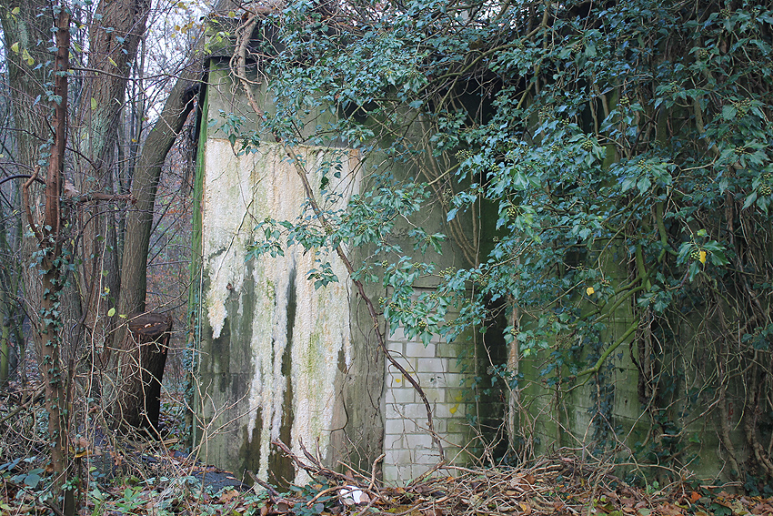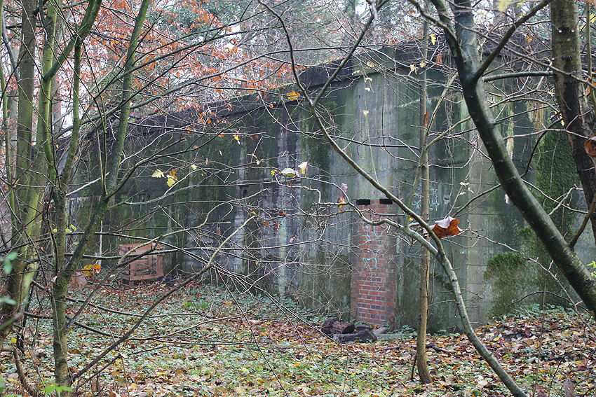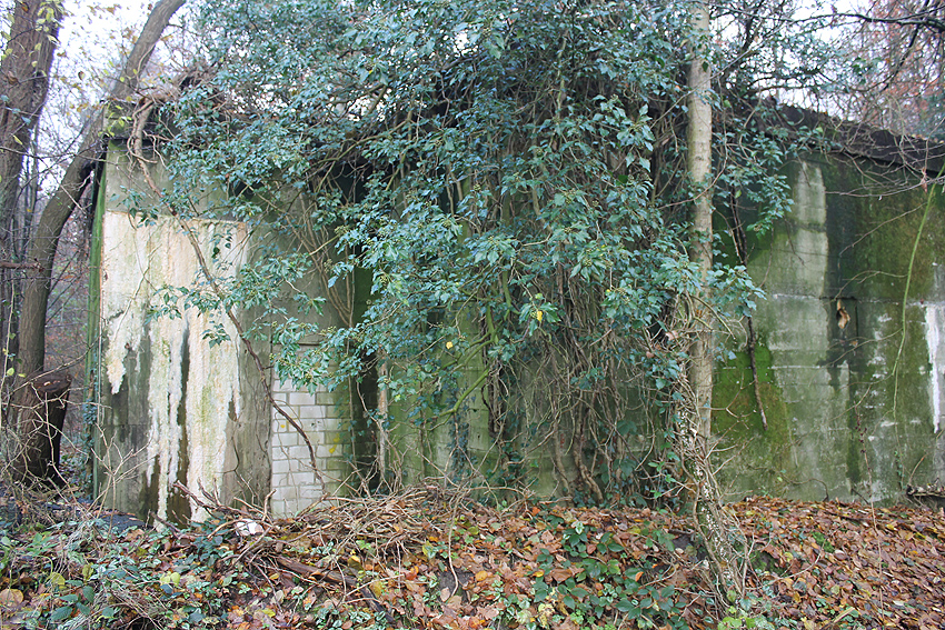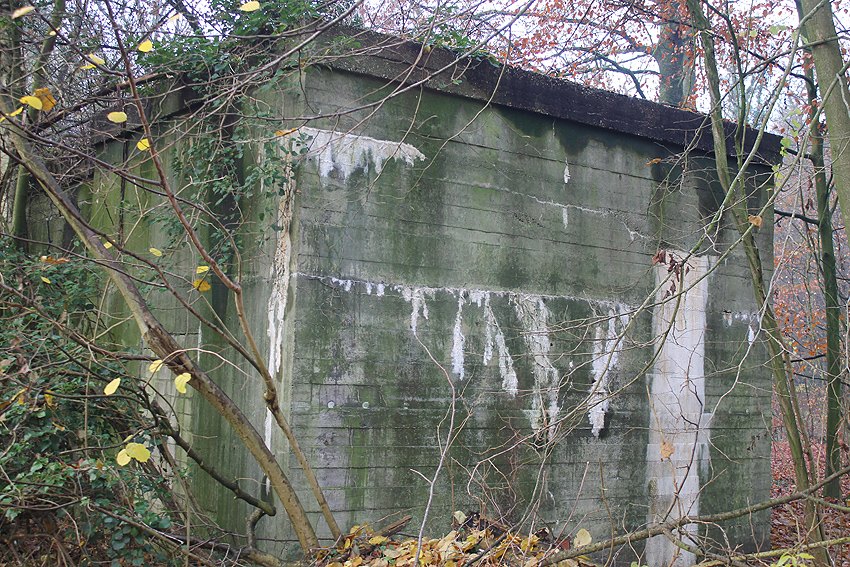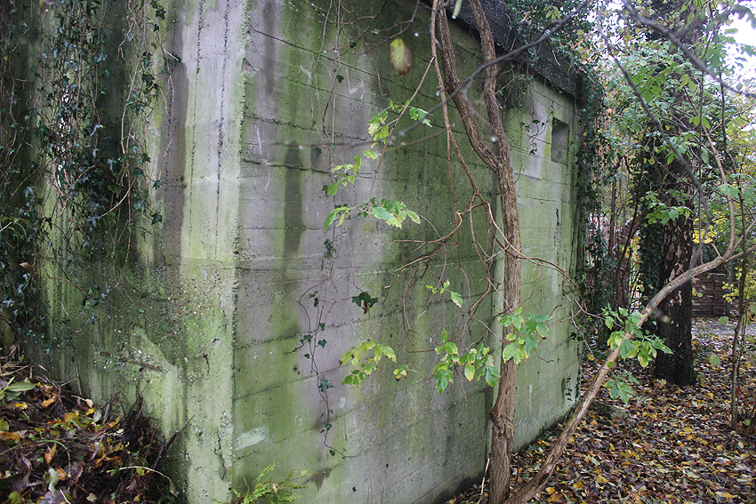 Ein rechteckiger, wohl bombensicherer Bunker (Kleinbunker) mit vier Eingängen (fast alle komplett zugemauert)...