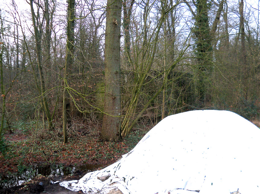 Auf dem Gelände befindet sich zusätzlich ein "Zeltartiges Etwas". Was ist das? Doch wohl nicht noch ein Bunker? Über das Objekt scheint eine Art Plane gestülpt zu sein. Von weitem gesehen besteht durchaus gewisse Ähnlichkeit mit einem (kleinen?) LS-Turm der Bauart Winkel mit Splitterschutzvorbau (links).