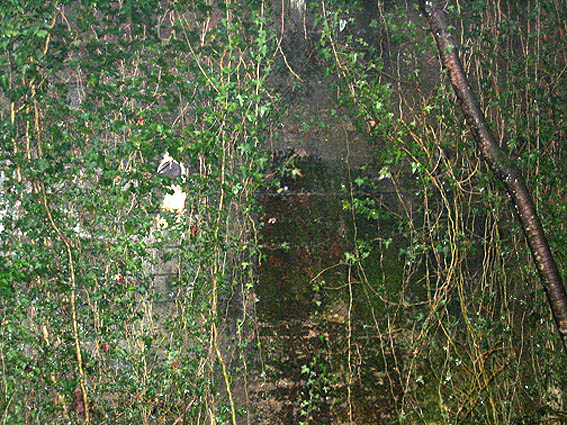Neben dem Bauwerk befindet sich der herausgehebelte Notausstiegsbetonblock querliegend auf dem Erdreich. An der Außenwand erkennbar ist der Schiftzug: